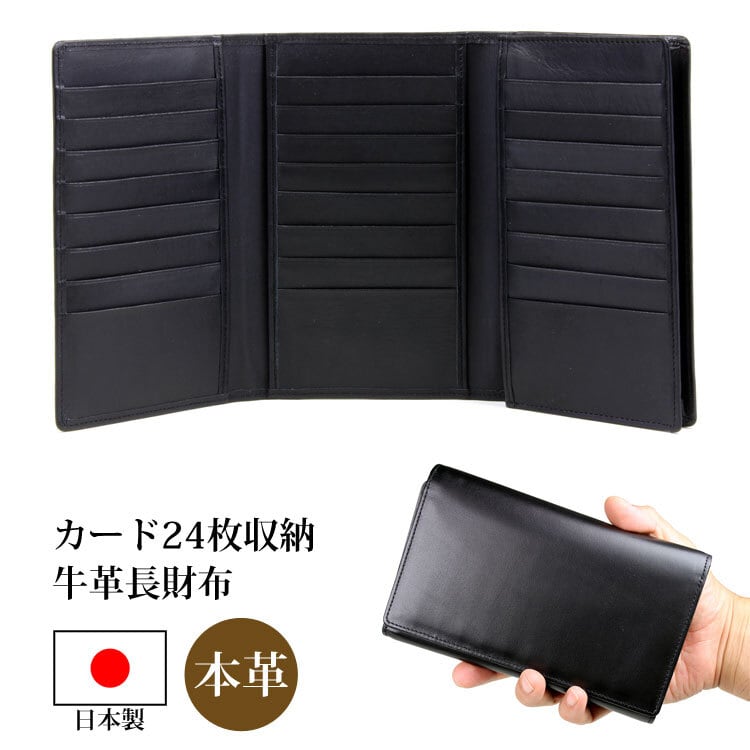 【サイズ(最大部を計測)】縦幅約11.5cm 横幅約18cm 厚み約2cm 【重さ】約140g 【内側収納】札入れ×1、ファスナー小銭入れ×1、カード入れ×24、オープンポケット×3 【外側収納】無し 【留め具】無し 【素材】牛革 【生産国】日本