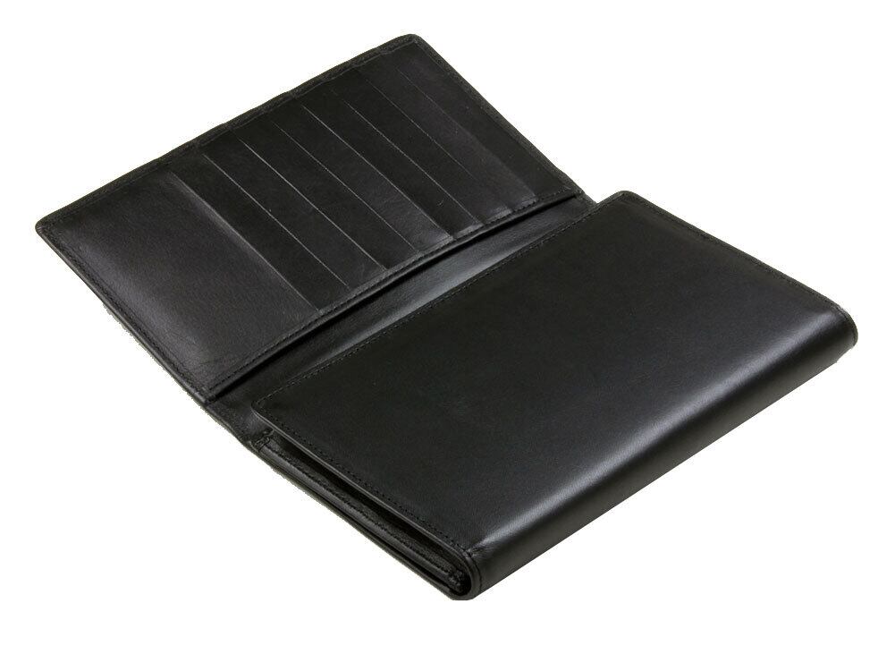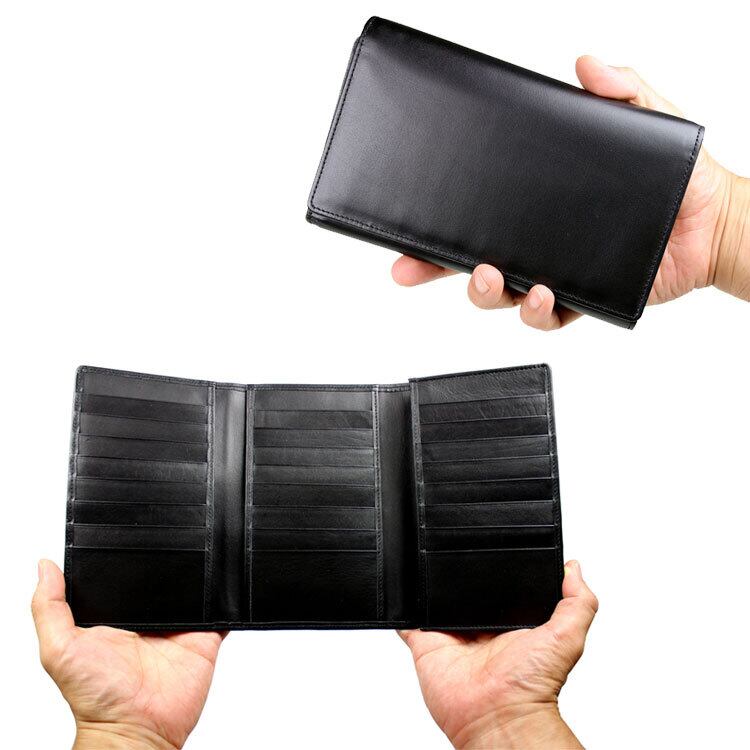 国産のスムース牛革を贅沢に使った三つ折り財布です。カードが24枚収納できるポケットがあります。札入れは、100万円の札束も収納可能です。