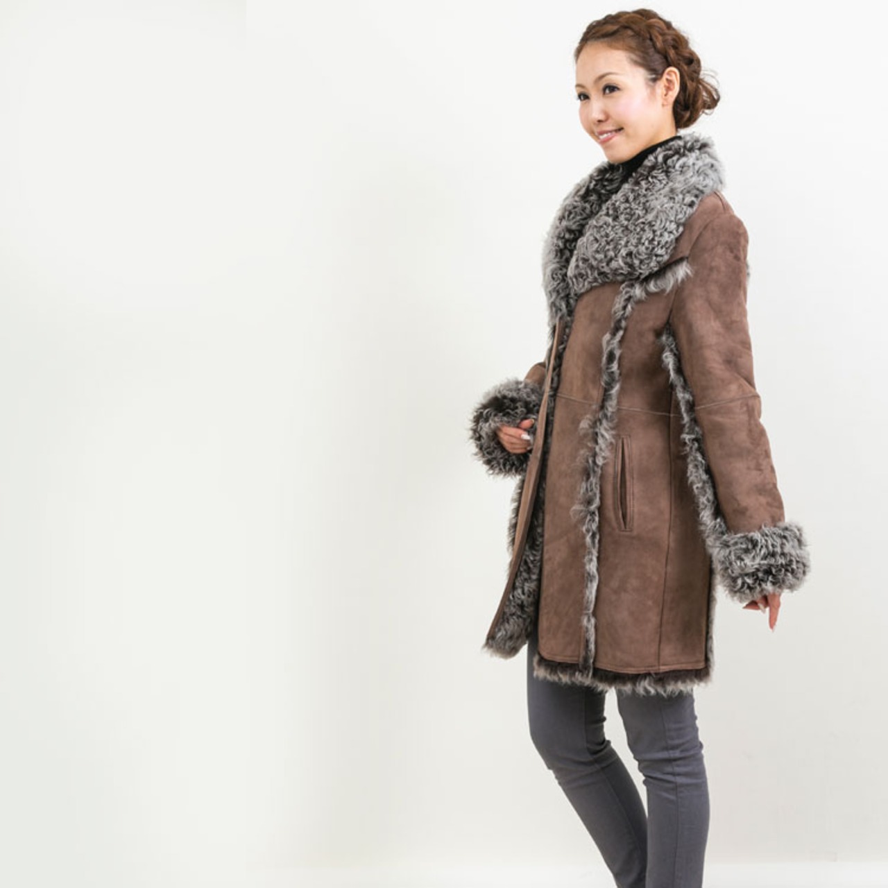 母の日 / ギフト / プレゼント / セール / 敬老の日 / 高級素材「カラクルラム」を使用したWフェイスファージャケット。毛先を白く染めたスノートップ加工が、より温かみと上品さを感じさせます。