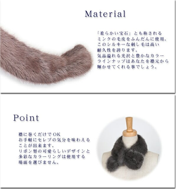 母の日 / ギフト / プレゼント / セール / 敬老の日 / 毛皮の代名詞とも言えるミンクを使用したリッチなマフラーです。「柔らかな宝石」とも言われているミンクは光沢があり、肌触りもシルキー、更に高い耐久性も特徴です。そのミンクを個性的デザインのファーマフラーに仕上げました。スリットに通して巻くだけで可愛らしいリボンに見えるアイディアマフラー。使用頻度もついつい上がってしまうはず。高級感のある深い色合いの7色をご用意。普段のコーディネートにもうワンポイント加えたい時にオススメの一品です。