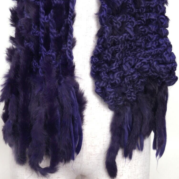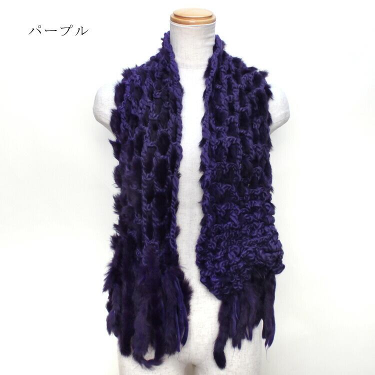 母の日 / ギフト / プレゼント / セール / 敬老の日 / アクリルニットにラビットを編み込んだファーマフラーです。やや長めのマフラーなのでくるくると巻いたり、半分に折って巻いたりとアレンジが可能です。両端にはアクリルニットとファーの房飾りが付いています。ざっくりニットとふわふわファーの組み合わせはカジュアルからパーティースタイルまで使い回しの利くファーアイテムです。