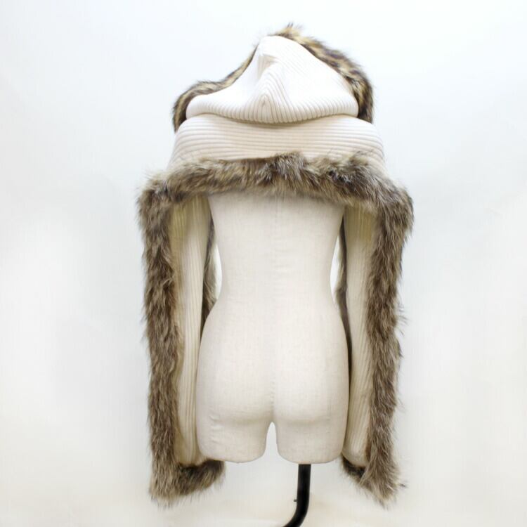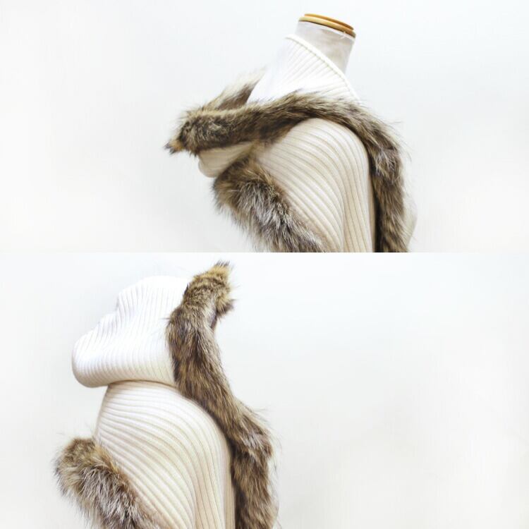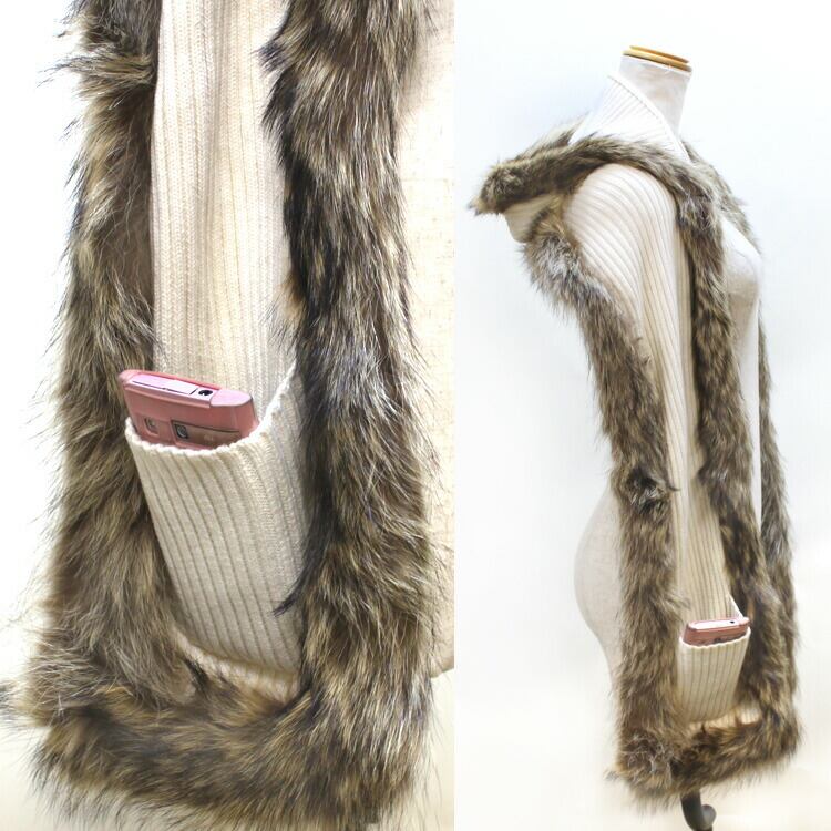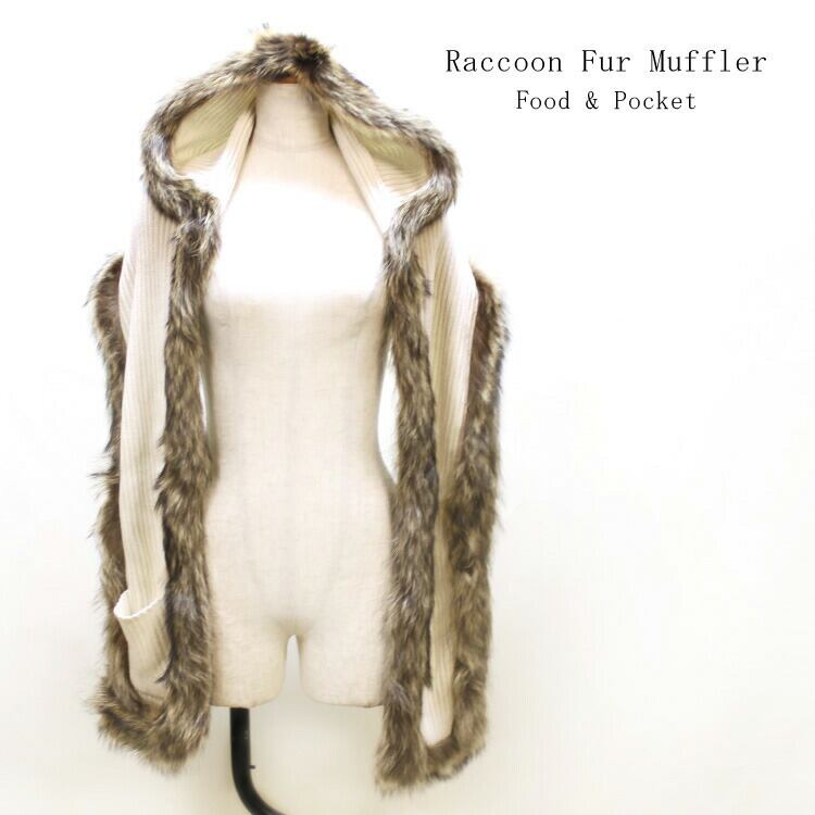 伸縮性のあるウール素材のニット生地の周りを、ふんわりとしたラクーンファーでトリミングした大判マフラーです。ざっくりとしたローゲージのニットとラクーンのワイルドな毛並みはカジュアルながら温かみのあるコンビ。片側に付いたポケットもポイントです。更にマフラータイプでありながらフード付き!オーソドックスに首に巻いて使用する以外に、ストールのように肩から掛けてフードを被ればベスト風の着こなしも出来ます。付け方で見え方を帰ることの出来る、遊び心のあるお洒落なアイテムです。