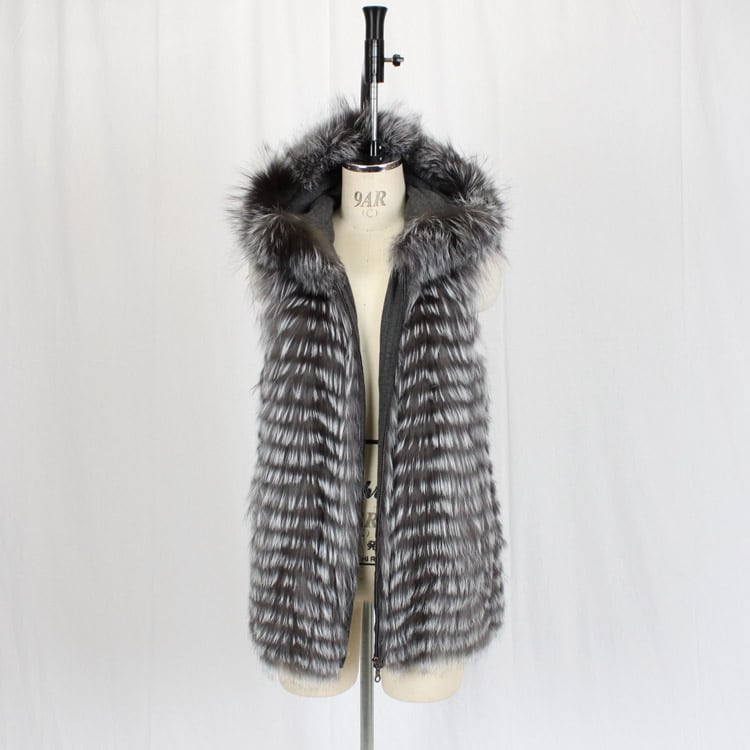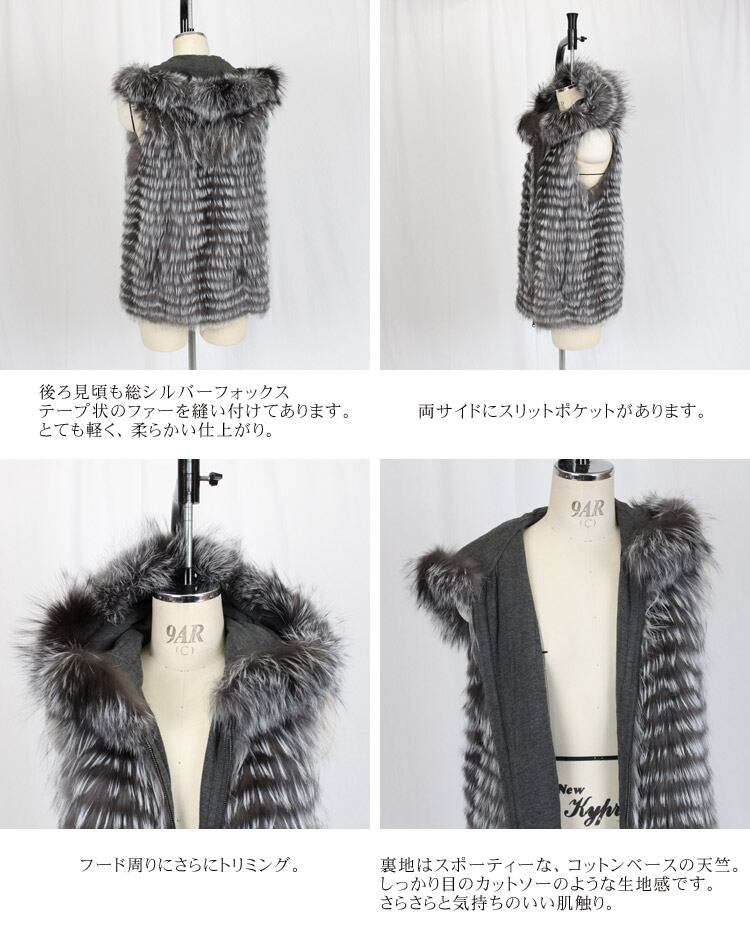 母の日 / ギフト / プレゼント / 華やかなシルバーフォックスファーのベストです。ジップアップで、フード付きっていうのがスポーティーで新鮮なのですが、裏地使いも面白くて、コットンベースの天竺編み生地なんです。よくカットソー等に使われる生地を、もっとしっかりさせたという印象。さらさらと快適な肌触りで、とても気持ちいいですよ。