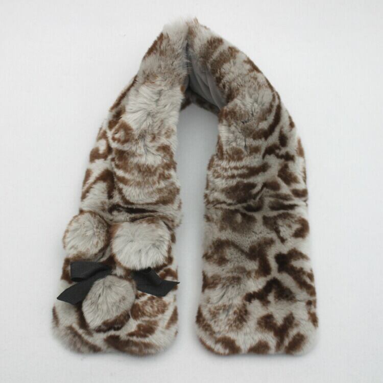 ラビット最高級種の、ふわふわのレッキスラビットにアニマルプリントと小さなボンボリ・リボンをあしらった可愛らしいファーマフラー。毛の密度が濃くとても暖か!また、毛抜けが少ないのもレッキスラビットの良い所。