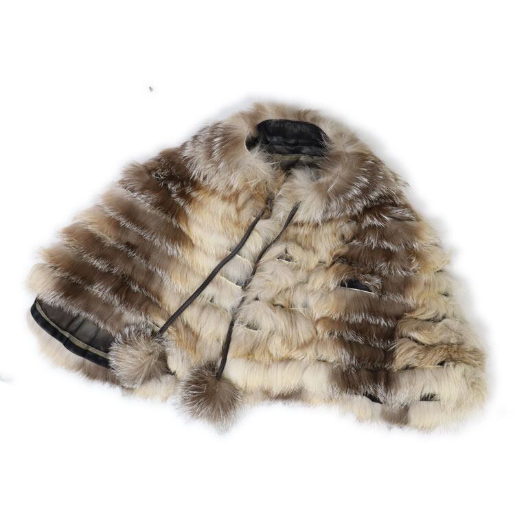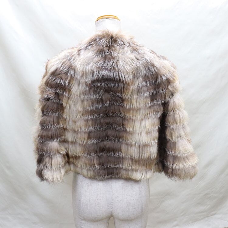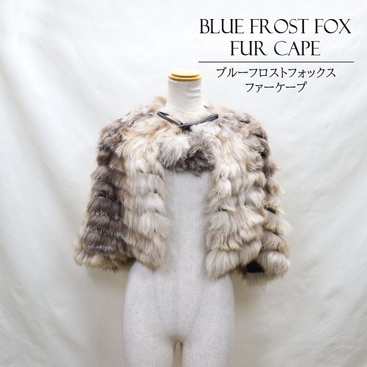 ブルーフォックスの毛質にシルバーフォックスの毛色を兼ね備えた品種、【ブルーフロストフォックス】のゴージャスなケープです。ボーダーのようにフォックスをテープで配置する事によって、ブルーフロストフォックスの美しい毛並とグラデーションを、より際立たせています。