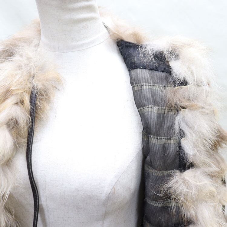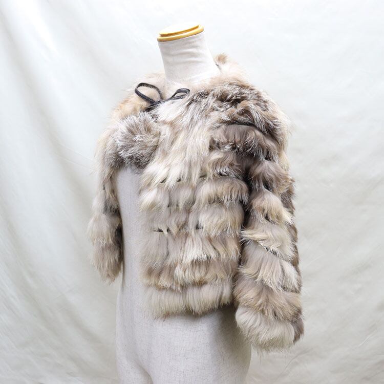 【サイズ(最大部を計測)】裄丈約57cm 着丈約44cm 【重さ】約170g 【留め具】リボン1組 【裏地】有り 【素材】ブルーフロストフォックス、シフォンシルク