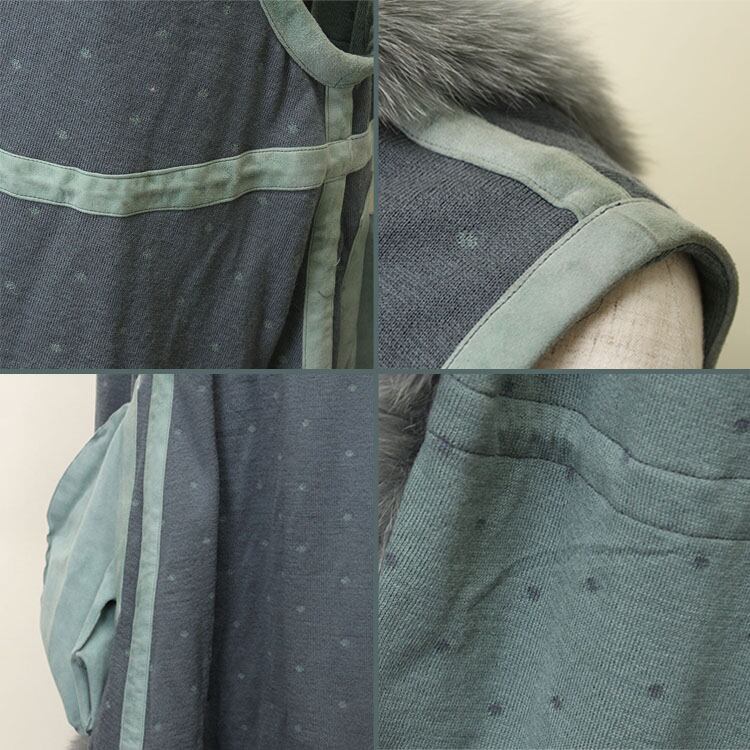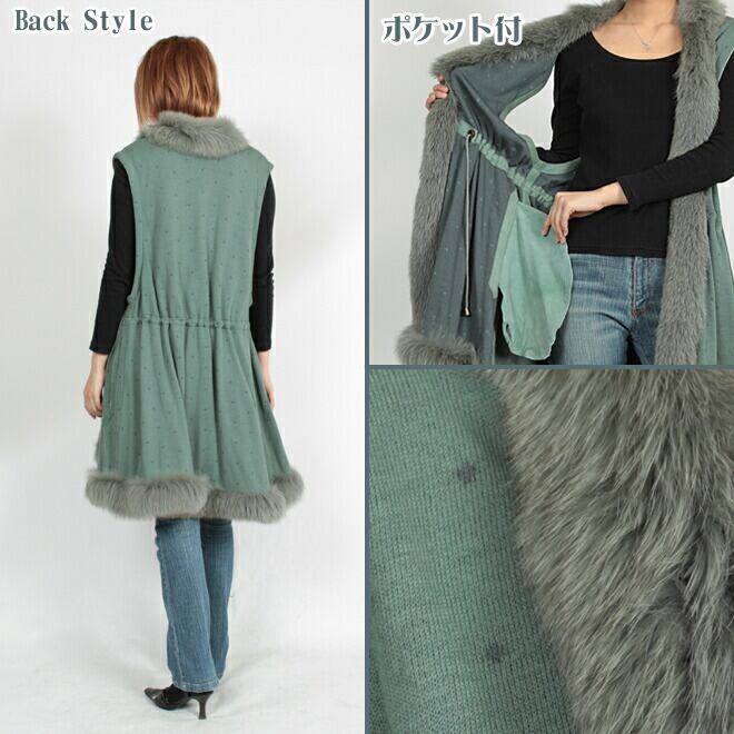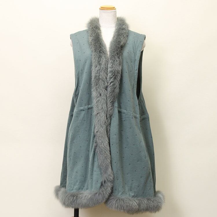 母の日 / ギフト / プレゼント / セール / 敬老の日 / ニットジレにボリューミーなブルーフォックスをトリミング。長毛のファーの揺れる裾がとてもエレガント。普段のコーデにプラスすれば、Iラインが強調されて細見え効果も。バックスタイルはまるでワンピースのようにキュート。ニット部分にはさりげないドット柄で、他に無い個性的なデザインになっています。ウエストに調節できるヒモ入り。
