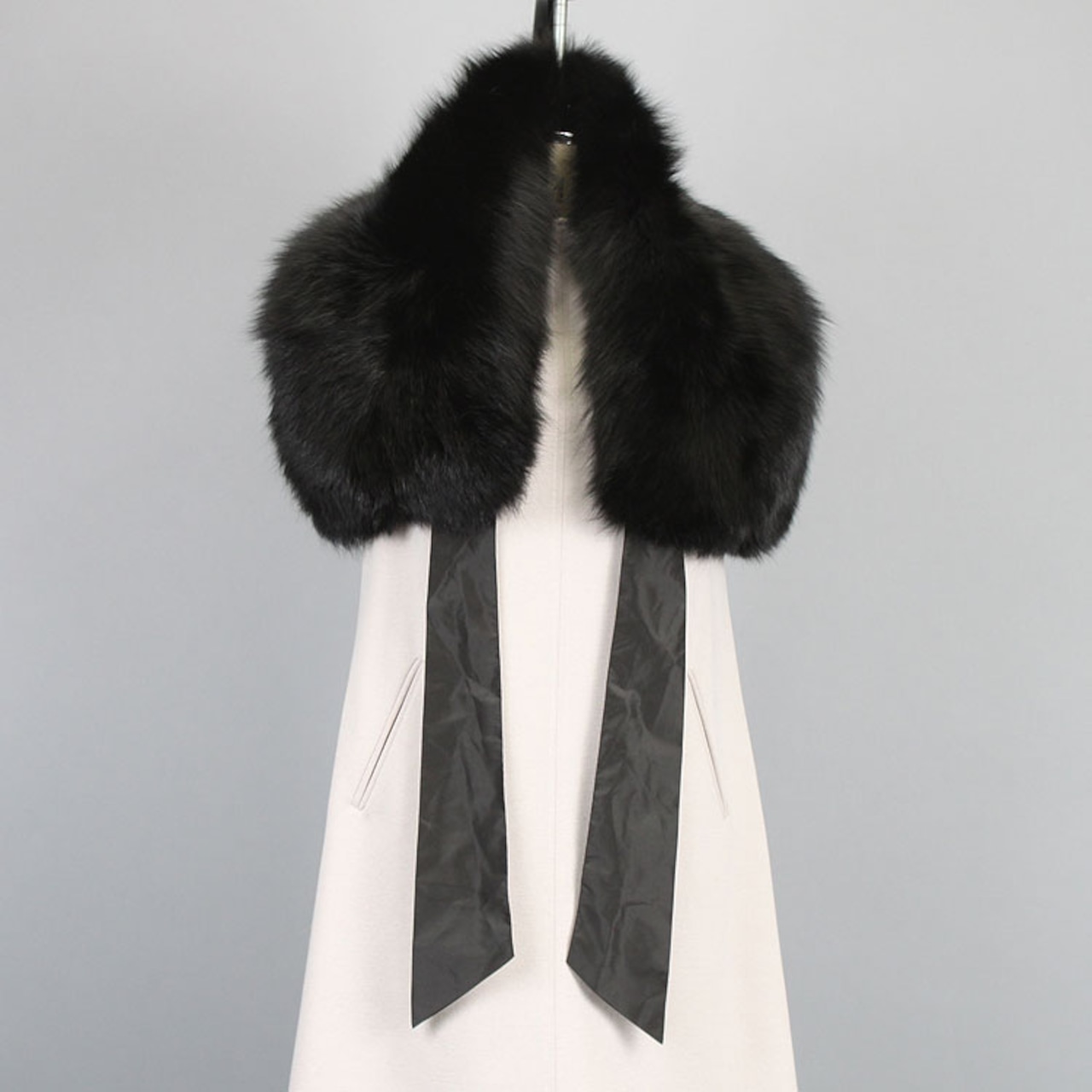 艶の映えるブラックカラーが美しい、大判のフォックスファーマフラー・ティペット。リボンで結んで留めるフェミニンなスタイル。パーティーなどに是非使いたいアイテムです。