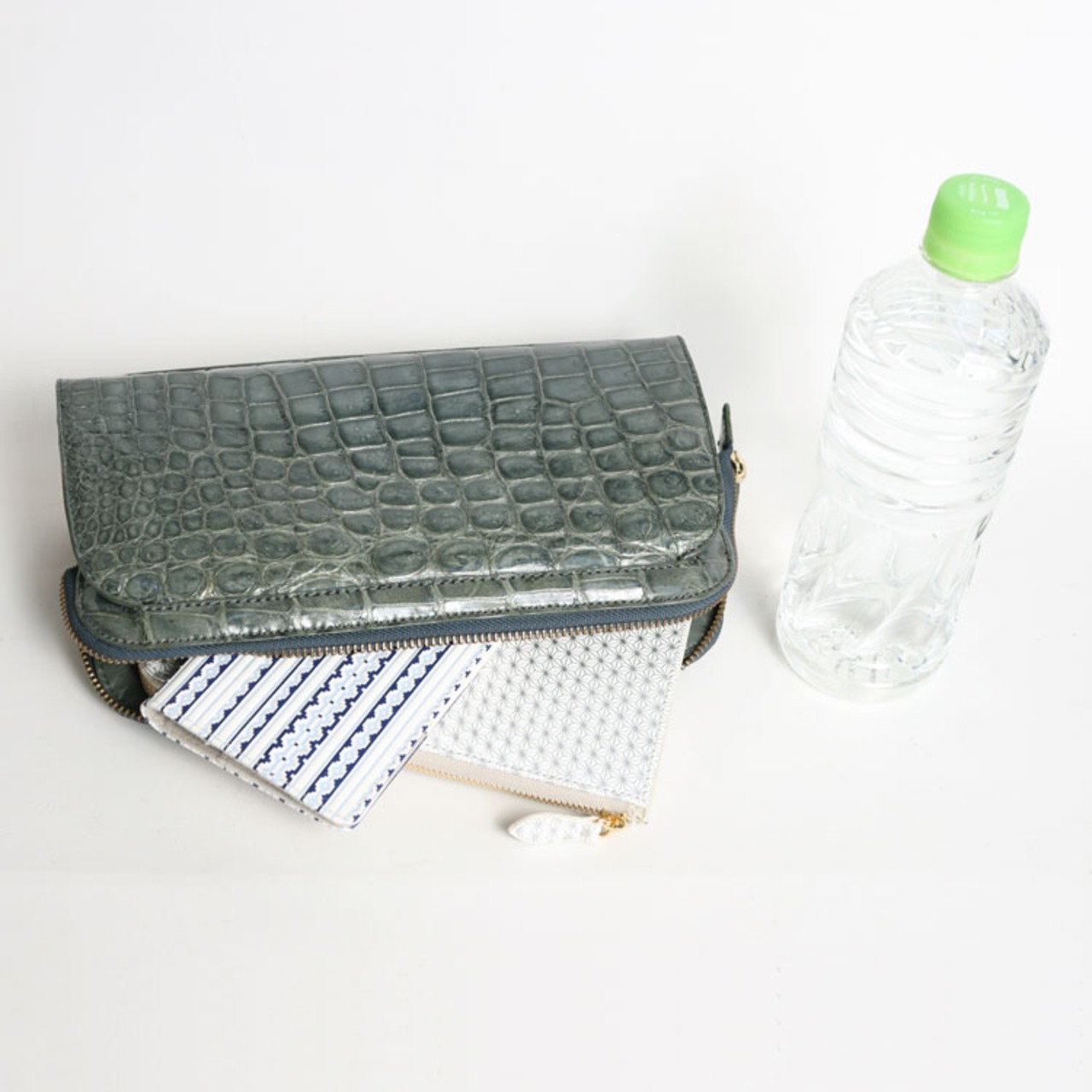 【サイズ(最大部を計測)】縦幅約14cm 横幅約25cm マチ幅約6.5cm 【重さ】約260g 【内側収納】ファスナー付きポケット×1、オープンポケット小×1 【外側収納】無し 【留め具】ファスナー 【素材】ナイルクロコ 【裏地】有り