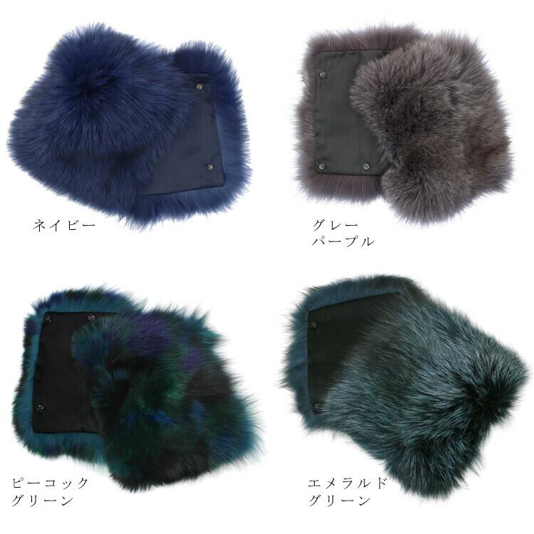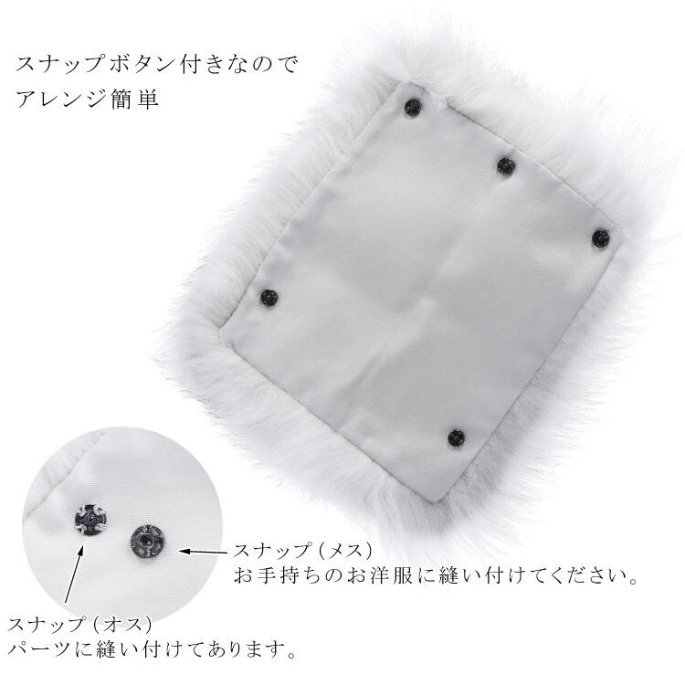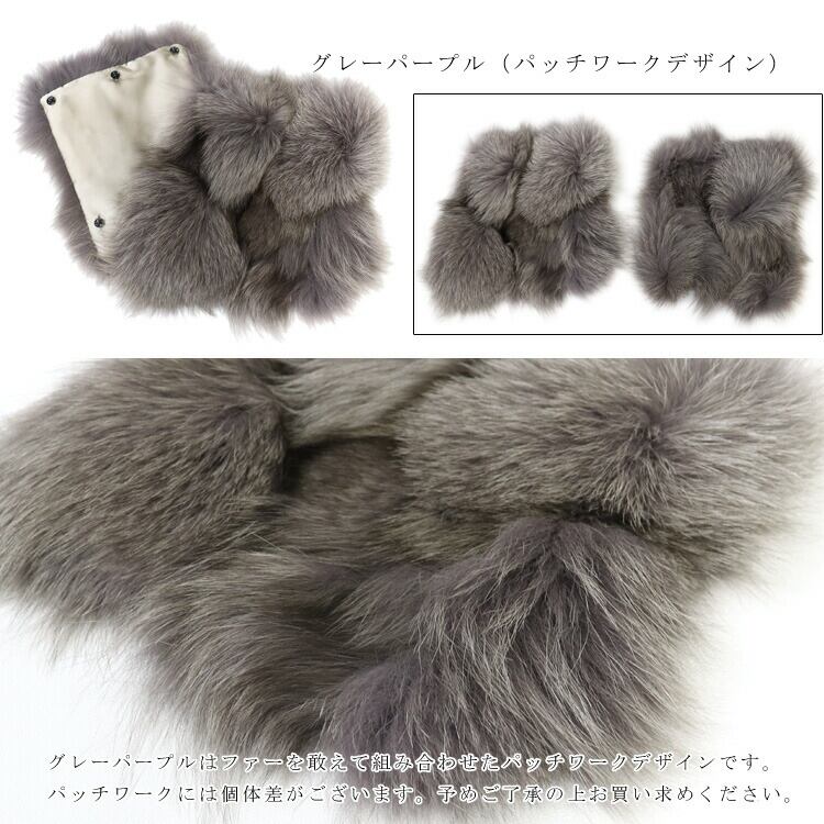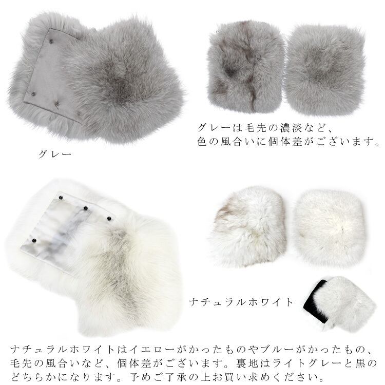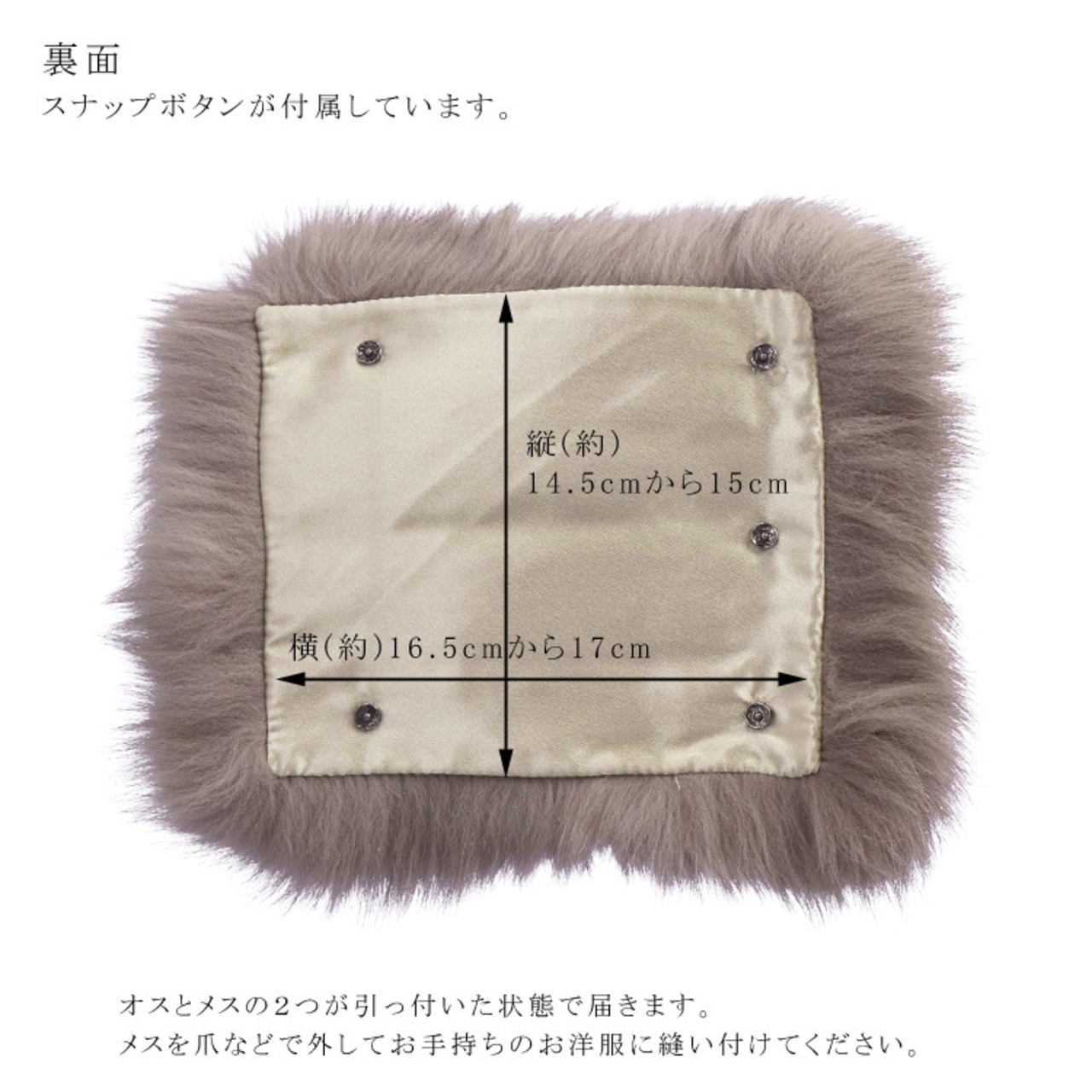 【サイズ(最大部を計測)】毛を含まず:縦幅約16.5cm、横幅約14cm 【重さ】約70g(約35g×2) 【脱着】スナップボタン×5 【裏地】有り 【素材】フォックス、サテン生地 【生産国】日本