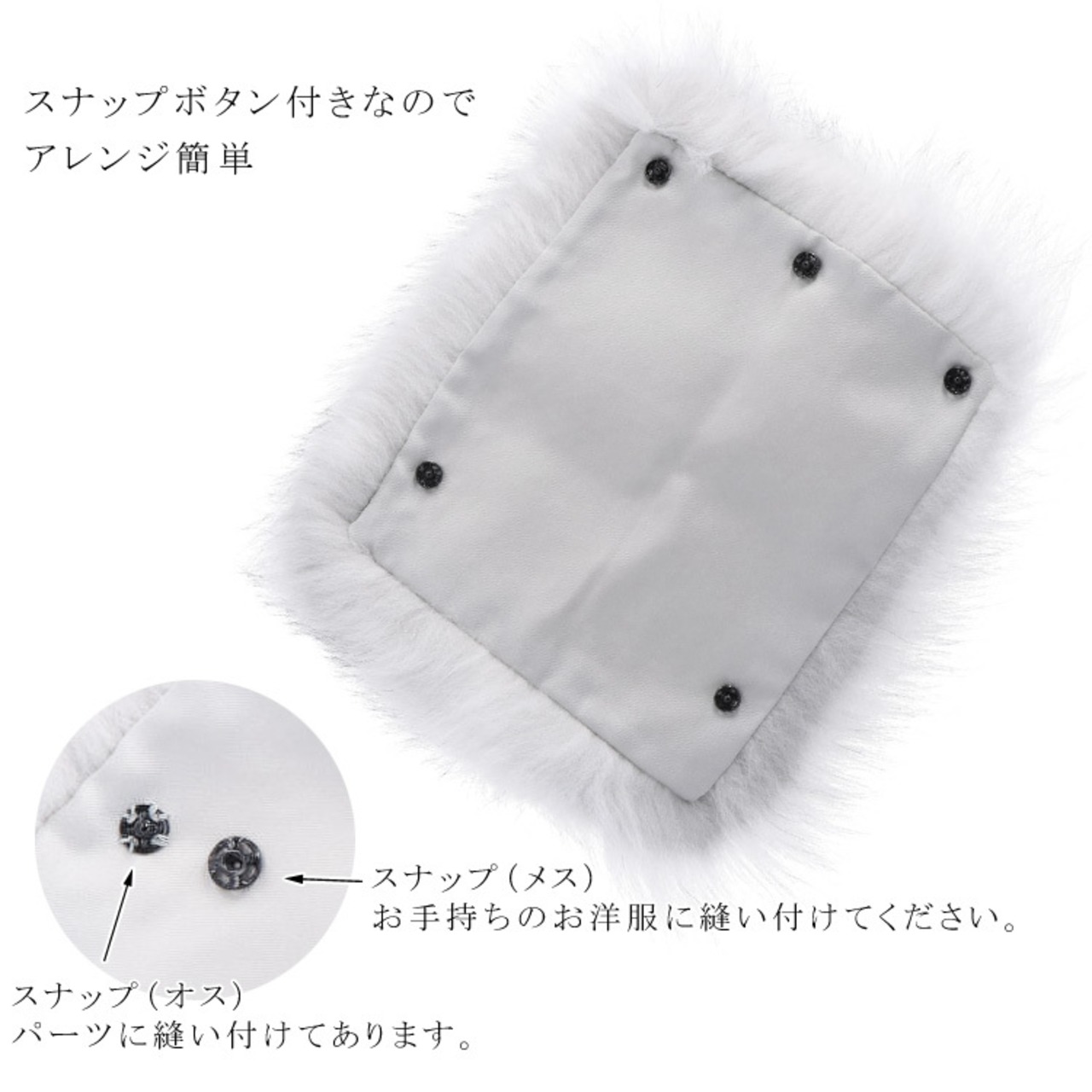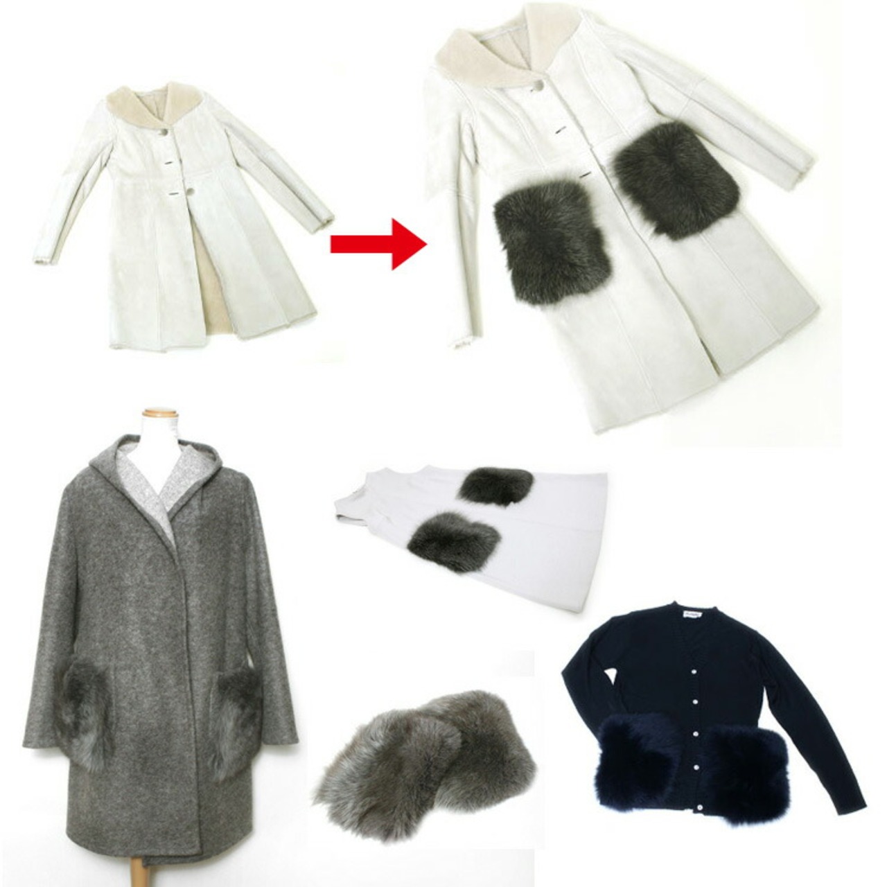 毛足が長くてラグジュアリーなフォックスのファーポケットです。あなたのお気に入りのコートや、飽きてしまったコートなどに付けてみてはいかがでしょうか。左右ペアで、スナップボタン付き。コートのポケット部分にスナップボタンを縫い付け、取り付けてくださいませ。ポケットがないお洋服のフェイクポケットとしてもカワイイ。縫製が苦手な方は、簡単にお手持ちの安全ピンで取り付けても◎