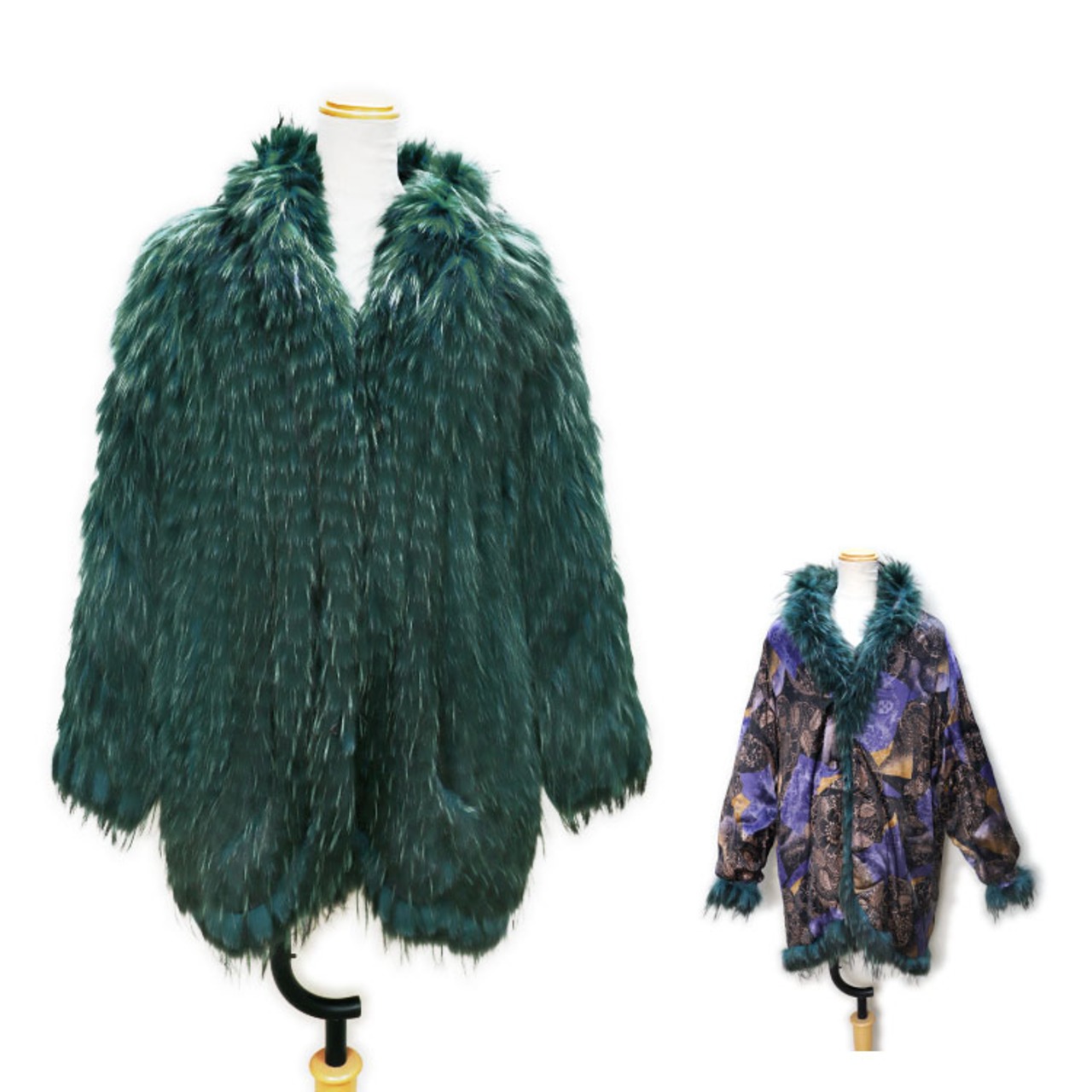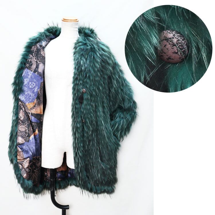 【サイズ(最大部を計測)】着丈約88cm 身幅約98cm 肩幅約40cm 袖丈約67cm 【重さ】約1000g 【内側ポケット】無し 【外側ポケット】2つ 【留め具】ボタン×3 【素材】フィンラクーン(タヌキ) 【裏地】有り