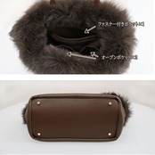 【サイズ(最大部を計測)】縦幅約20cm 横幅約30cm マチ幅約15cm ハンドル持ち上がり約18cm 【重さ】約390g 【内側収納】ファスナー付きポケット×1 オープンポケット×2 【外側収納】無し 【留め具】マグネットボタン 【裏地】有り 【素材】フォックスファー、ポリエステル