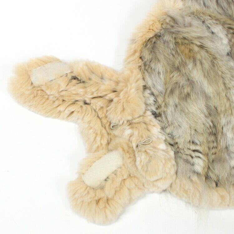 留め具の部分が、ふわふわレッキスラビットになっています。留め具はホック2つと、ホックの上からレッキスラビットを巻きつけ、マジックテープで留めることができホックで留めた部分をきっちり隠すこともできます。裏地がなく、ファーの温もりを肌いっぱいに感じることができます