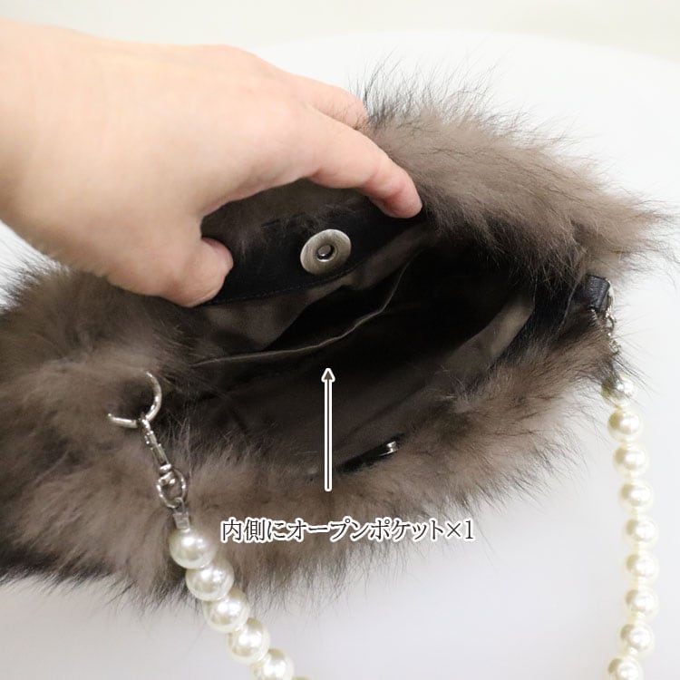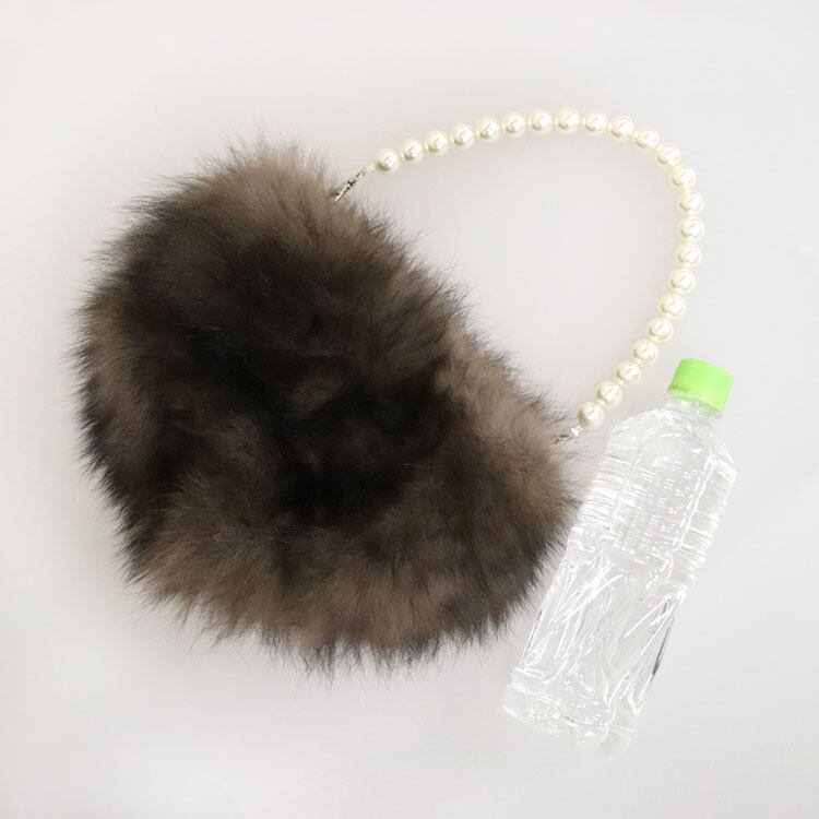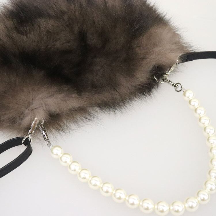 ふわふわのフォックスファーと大粒のパールのハンドルが可愛らしい2wayミニバッグです。パールは垂らしてポシェットにした時のワンポイントアクセとしてもお使いいただけます。