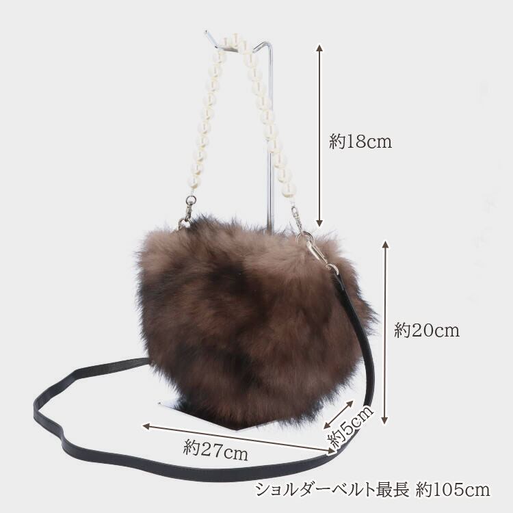 【サイズ(※毛先を含む最大部を計測)】縦幅約20cm 横幅約27cm マチ幅約5cm パールハンドル持ち上がり約18cm ショルダーベルト長さ最長約105cm 【重さ】約190g 【内側収納】オープンポケット×1 【外側収納】無し 【留め具】マグネットボタン 【裏地】有り 【素材】フォックス、パール(アクリル)