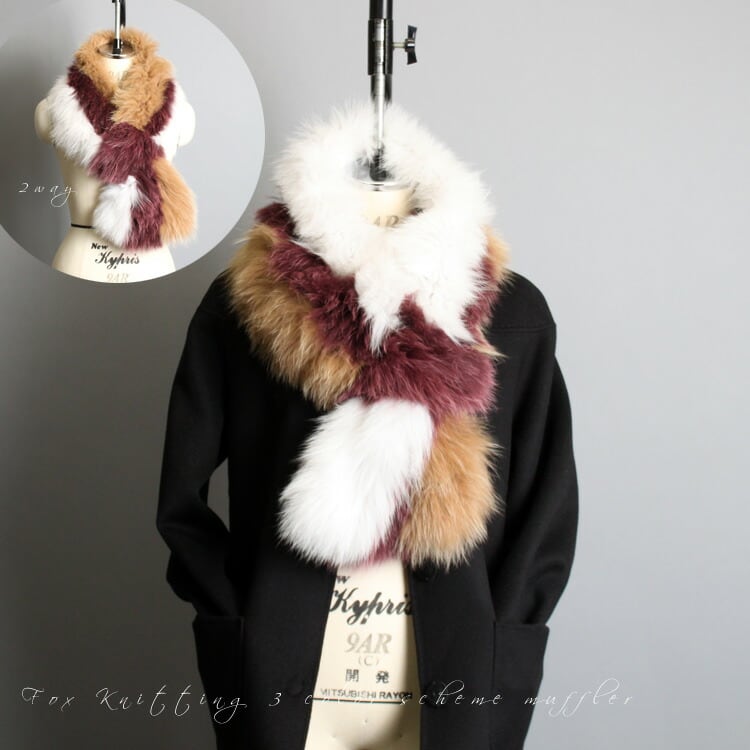 母の日 / ギフト / プレゼント / セール / 敬老の日 / 白、ワイン、キャメル。3カラーのフォックスマフラー。ボリュームのあるフォックスファーを編み込んだマフラーです。縦に3色の切り替えがあり、上下を変えるとまた違った雰囲気を楽しめます。編み込みの為、裏地を付けておらずファーの温もり、肌触りをそのままお楽しみいただけます。