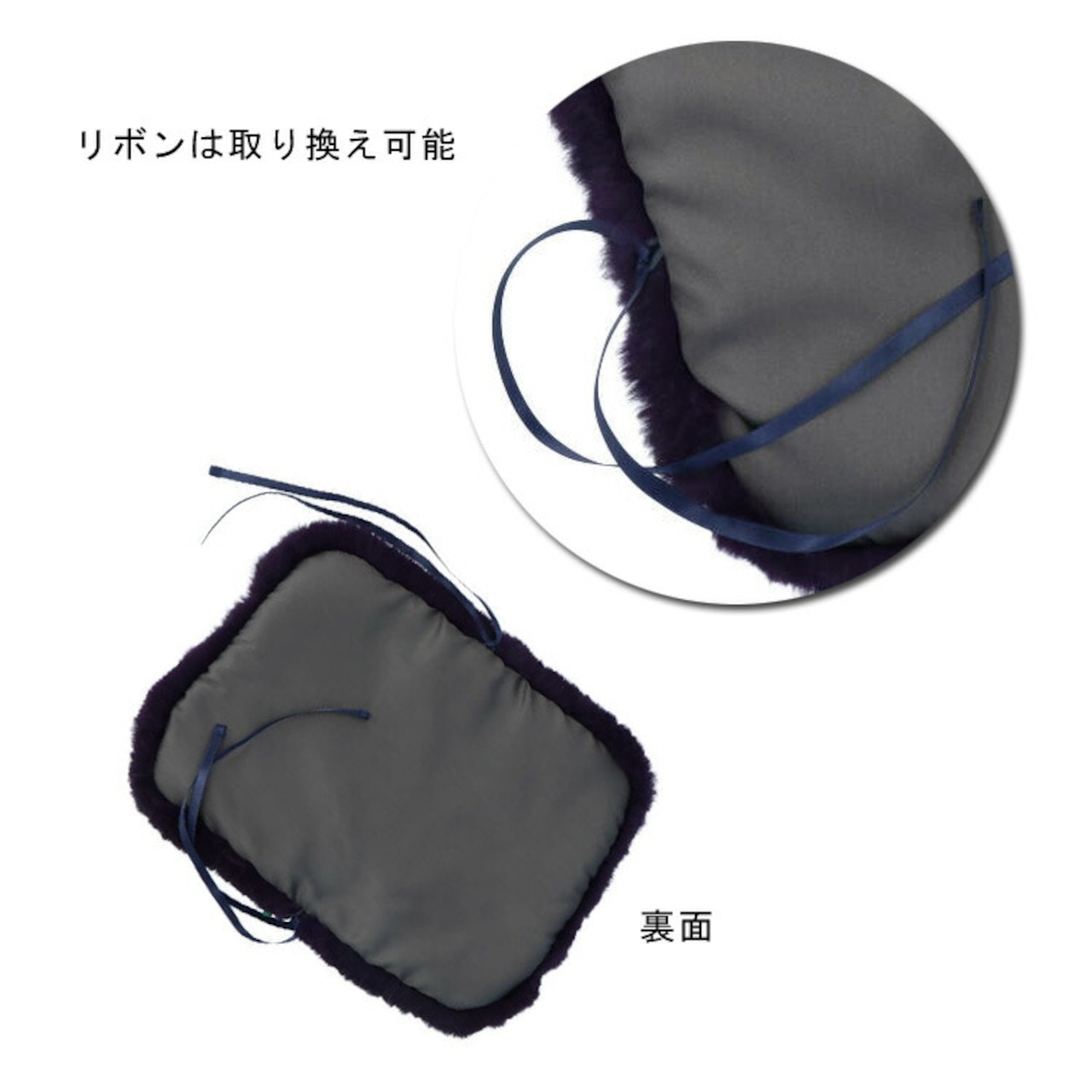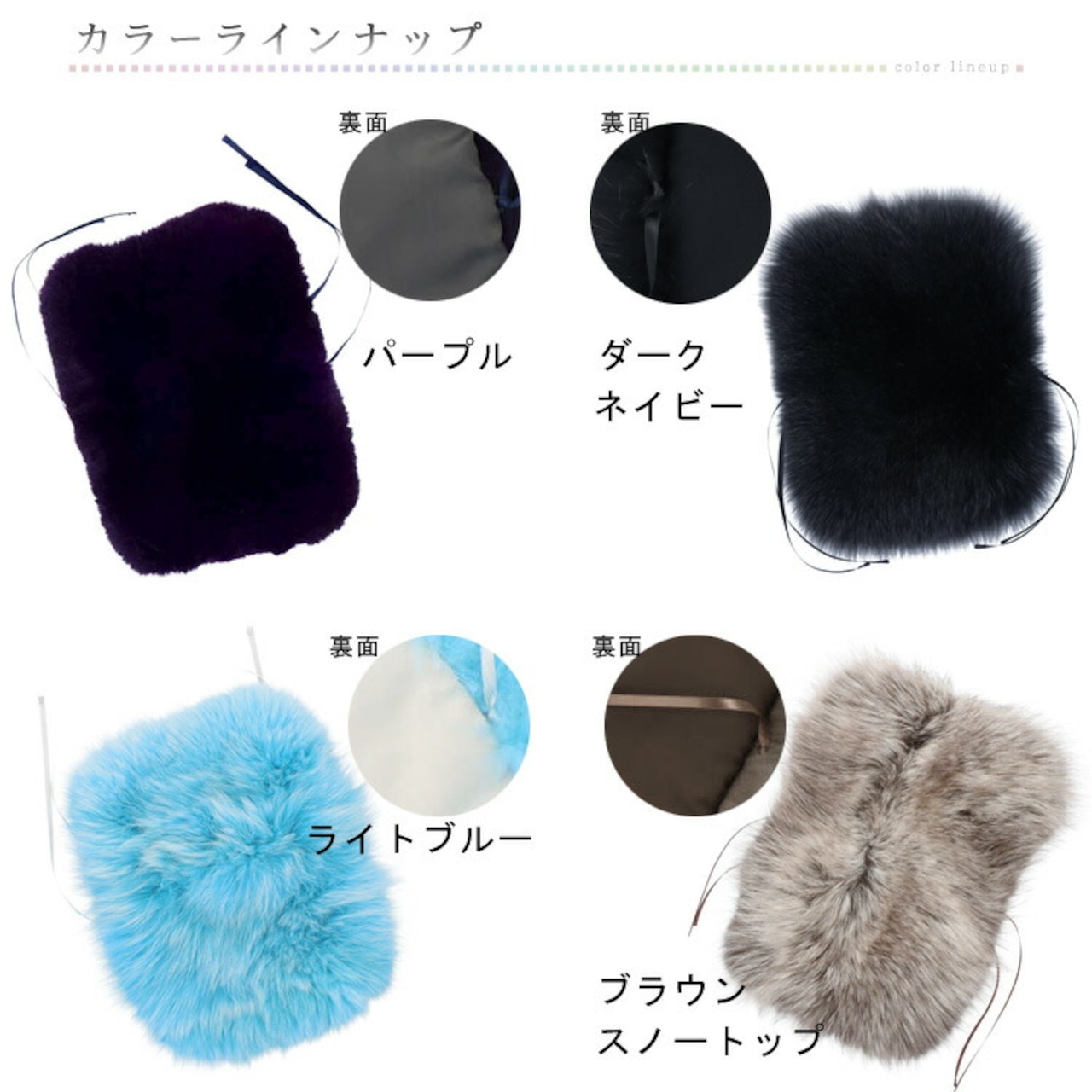 【サイズ(最大部を計測)】毛を含む:パープル縦幅約30cm 横幅約23cm、そのた縦幅約36cm 横幅約27cm / 裏地のみ:縦幅約28cm 横幅約20.5cm / 取り付け用ヒモ:約27cm×4本(約54cm×2本) 【重さ】パープル約75g、そのた約90g 【留め具】2箇所で紐結び 【素材】毛皮:ブルーフォックス 裏地・紐:サテン生地
