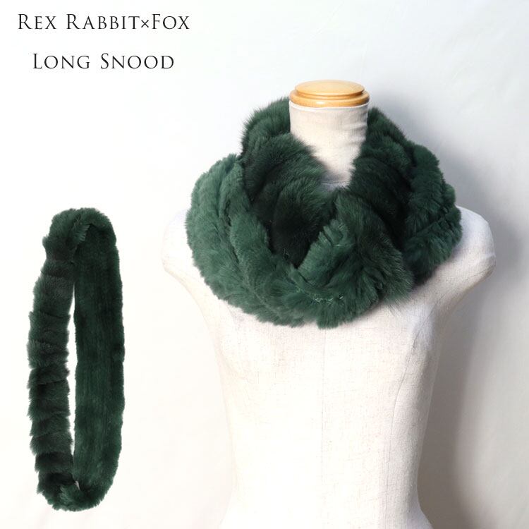 レッキスとフォックスを組み合わせたロングスヌード。ふわふわで温かく、しっかりと長さがあるので、そのまま首にかけても二重に巻いてもオシャレに決まります。