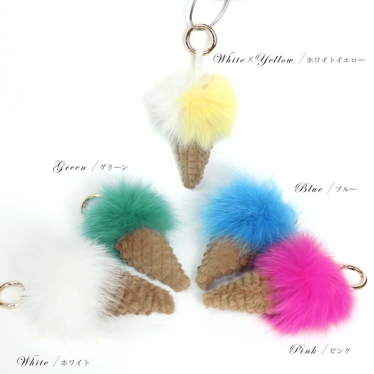 母の日 / ギフト / プレゼント / ボリュームたっぷりのフォックスファーのアイス部分と、気持ちいいラビットファーのコーン。毛質の違う2種類のファーを組み合わせた、とっても可愛いアイスファーチャームです。フォックスならではの長い毛足、ラビットの密度の濃い綿毛、2つの異なるファーによるふわふわの触り心地をお楽しみください。どこにでも取り付けられるリングでバッグが華やかに。(直径1cm以内の持ち手に取り付け可。)