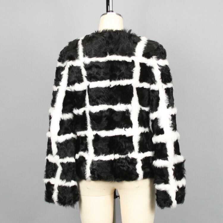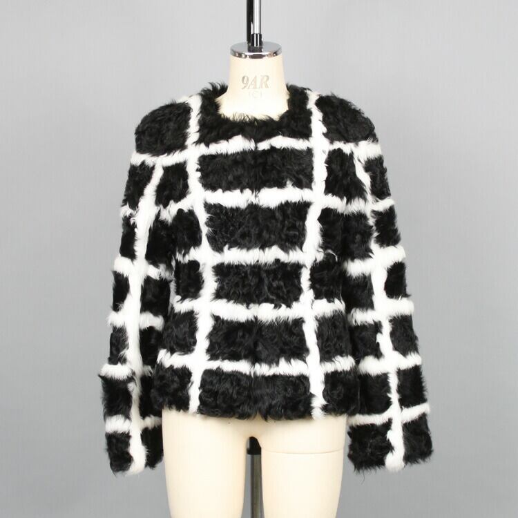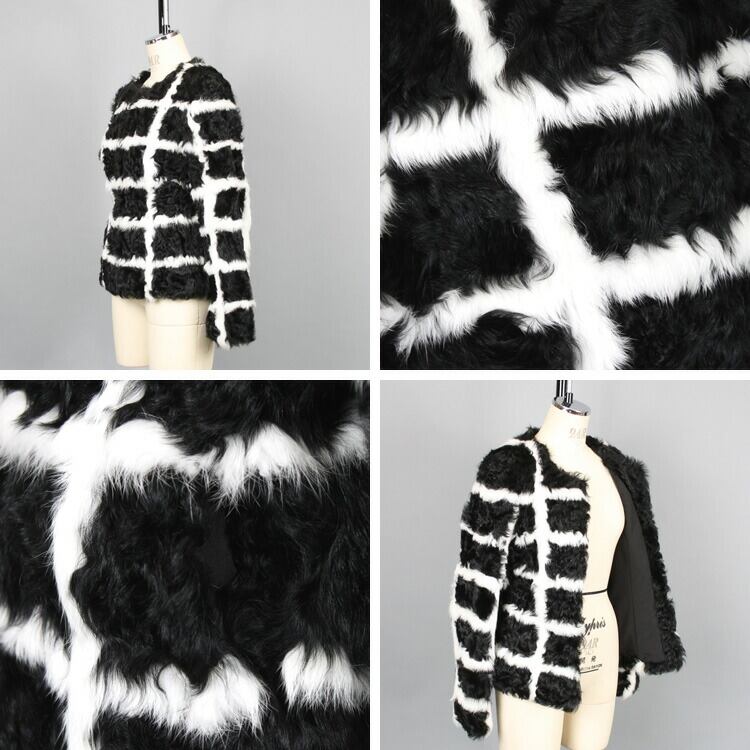 母の日 / ギフト / プレゼント / 黒と白の格子模様を鮮やかなカルガンラムで表現。個性的なノーカラーデザインのファージャケットです。上質なカルガンラムはクルクルとした見た目が可愛らしく、尚且つ、シルキーで光沢があり高級感があります。