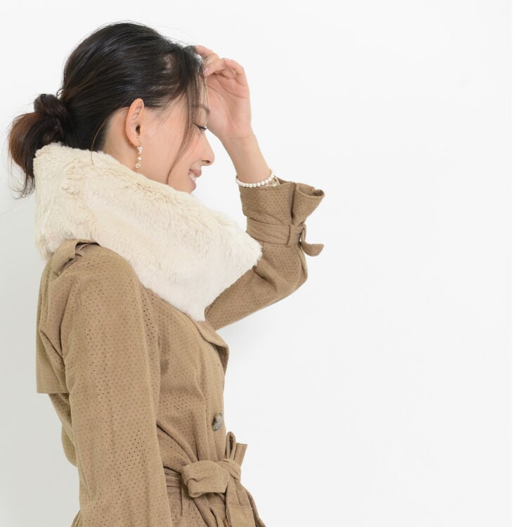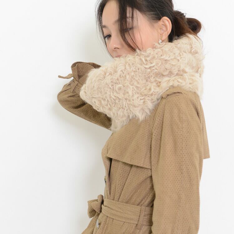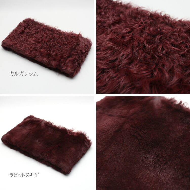 高級感のあるカール、深みのある色合いのカルガンラム、抜けやすい差し毛を処理した、ラビットヌキゲ(抜き毛)。この異素材を合わせてスヌードに仕立てました。どちらの面を向けてもファーフルスキンという贅沢なスヌードです。