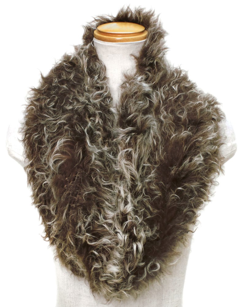 ボリューミィな巻き毛のラムファー仕様のスヌードです。シックなニュアンスカラーのラインナップで冬のコーディネイトがグッと締まります。首元でくしゅっと巻いてネックウォーマー風に、肩まですっぽり下げてケープ風にも。自由度の高さが人気の秘密です。細いファーのテープを編み込んだニッティング製法でデコルテをふんわりしなやかに包み込みます。くるんとした巻き毛のラムは暖かさも抜群!リッチなファーアイテムはプレゼントにも最適です。