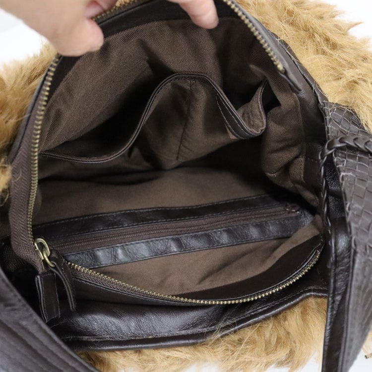 【サイズ(最大部を計測)】縦幅約24cm 横幅約40cm(底面円直径約18cm) ハンドル持ち上がり約25cm 【重さ】約550g 【内側収納】ファスナー付きポケット×1、オープンポケット×2 【外側収納】無し 【留め具】ファスナー 【裏地】有り 【素材】ラムファー、ラムレザー