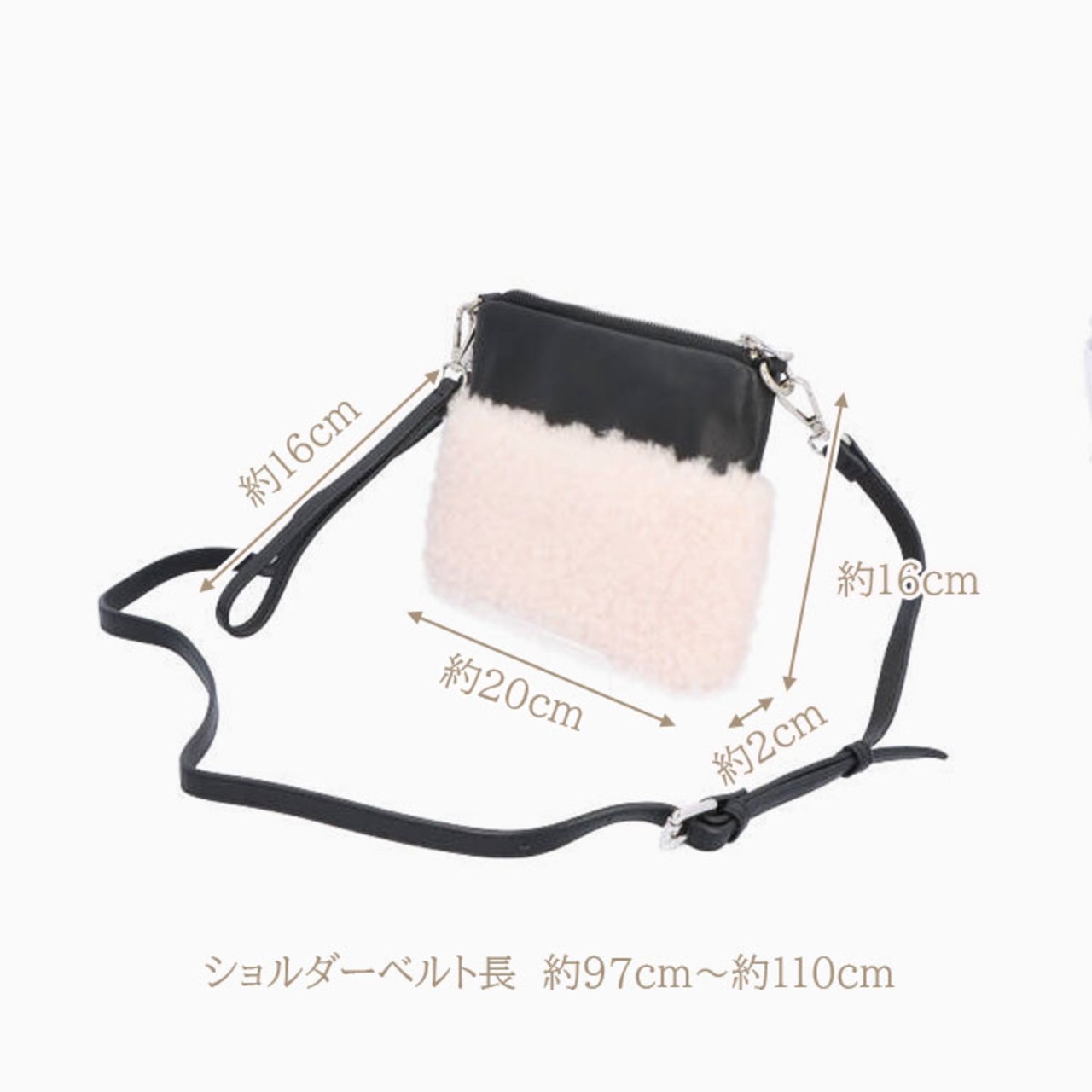 【サイズ(※毛先を含む最大部を計測)】縦幅約16cm 横幅約20cm マチ幅約2cm ストラップ持ち上がり約16cm ショルダーベルト長さ約97cmから約110cm 【内側収納】無し 【外側収納】無し 【留め具】ファスナー 【裏地】有り 【素材】ウール、ラムレザー