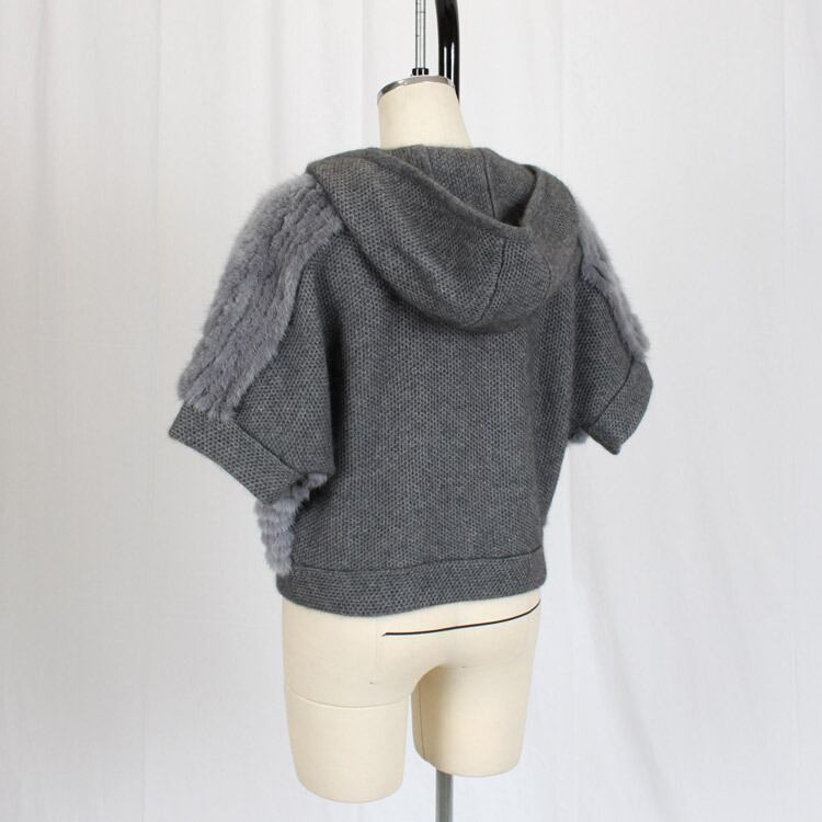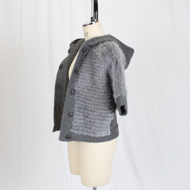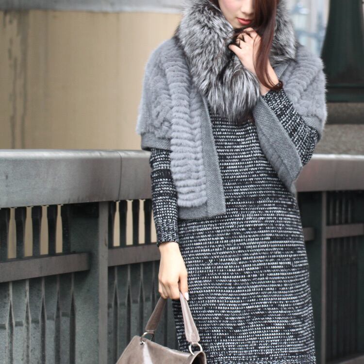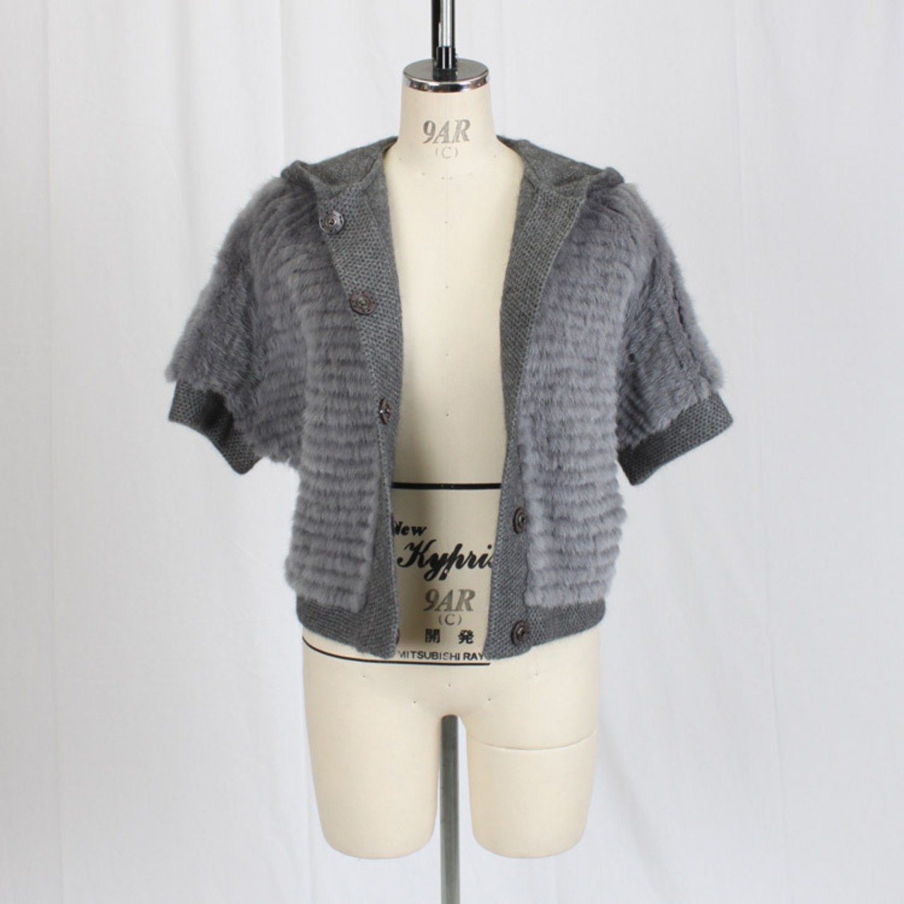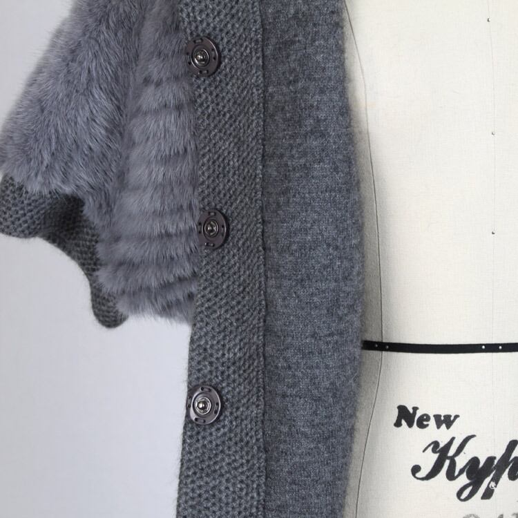 ミンクが大好きなあなたへ。都会的なちょっと濃い目のグレーカラーに染色したミンクのファーと、肌触りの良いカシミヤ混ニットのジャケットです。さらにファーストールを合わせるのも可愛いですよ♪袖はドルマンスリーブになっており、ふんわりとしたシルエットに。前身頃にはミンクをボーダー状に配置。フルスキンの物と比べて柔らかく、とても軽い仕上がりです。