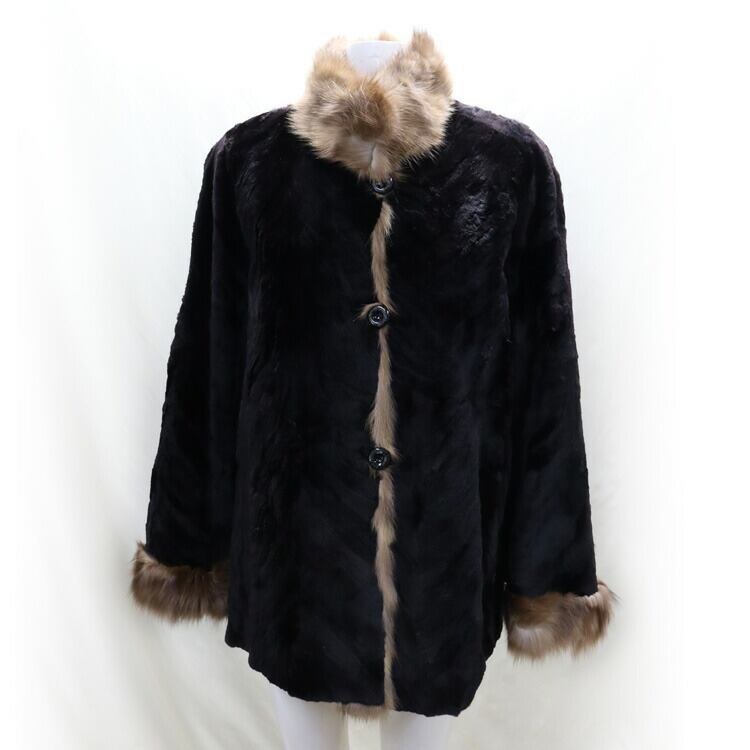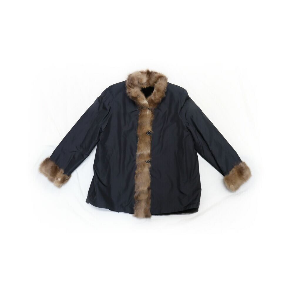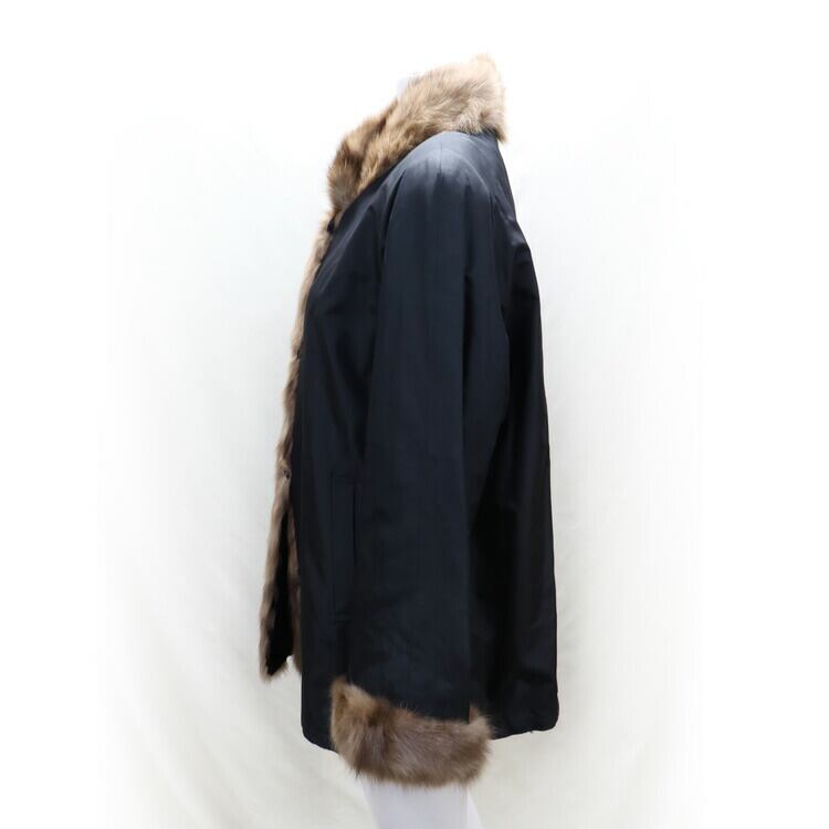 襟、ボタンライン、袖をミンクファーでデザインされたジャケット。シーンによってイメージを変える事ができるリバーシブル使用。ナチュラルなファーの色合いがブラックに映える上品なジャケットです。