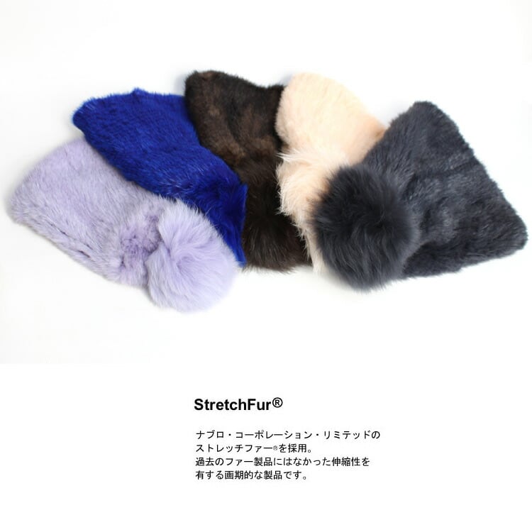 【ストレッチファー(R)】ニッティングの編地自体に伸縮性のある特許製法。従来の編み込みファー商品とは違い、ぴったりとしたフィット感が得られる。