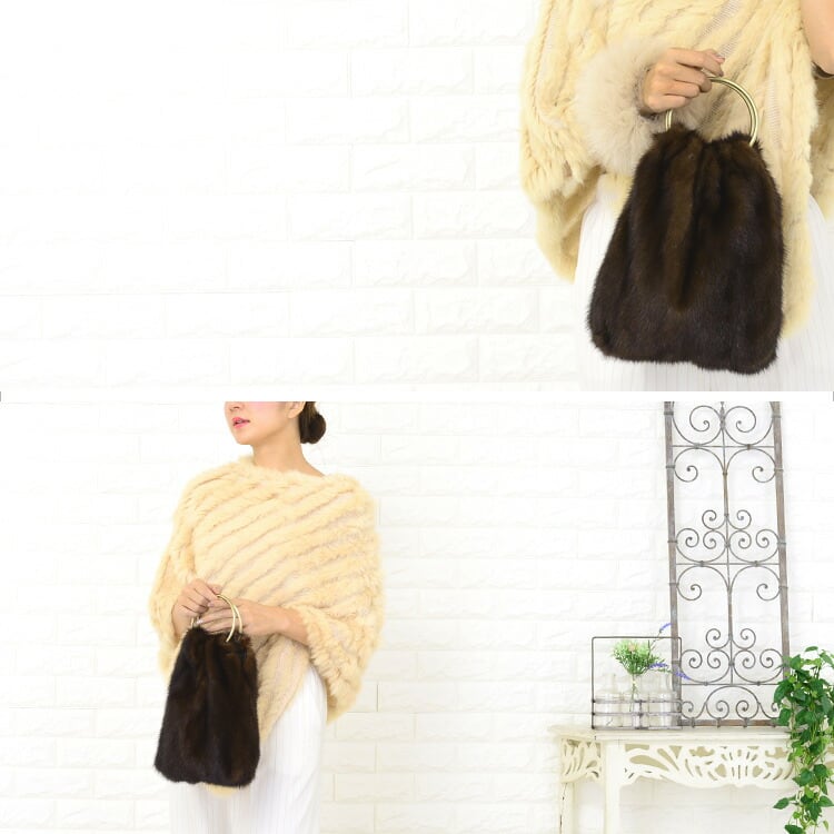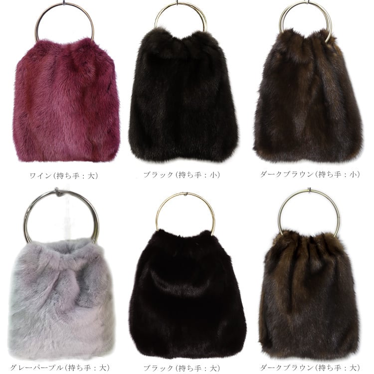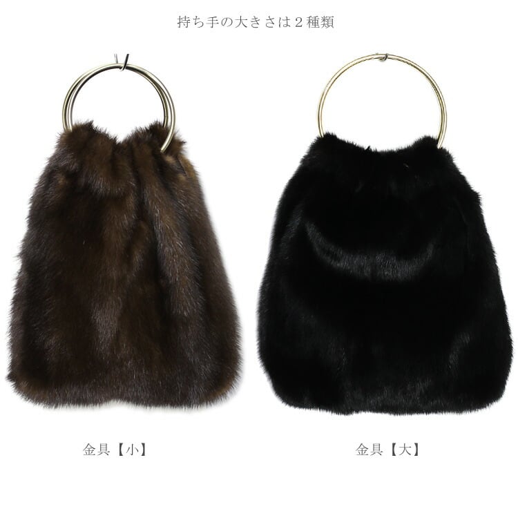 ファーの王様とも呼ばれるミンクを贅沢に使用した、美しい巾着型バッグです。弊社契約の日本の工房にて、1点1点手作業にて作られています。持ち手の大きさは2種類からお好きな方を選択できます。小さい持ち手でキュートに。大きい持ち手で腕を通して。長財布や500mlのペットボトルも入るので使い勝手◎結婚式などのパーティにも使えて便利なファーバッグ。口が開きすぎないので、中身も見えにくく安心。スチールのリング持ち手なので、高級感もありとってもオシャレです。