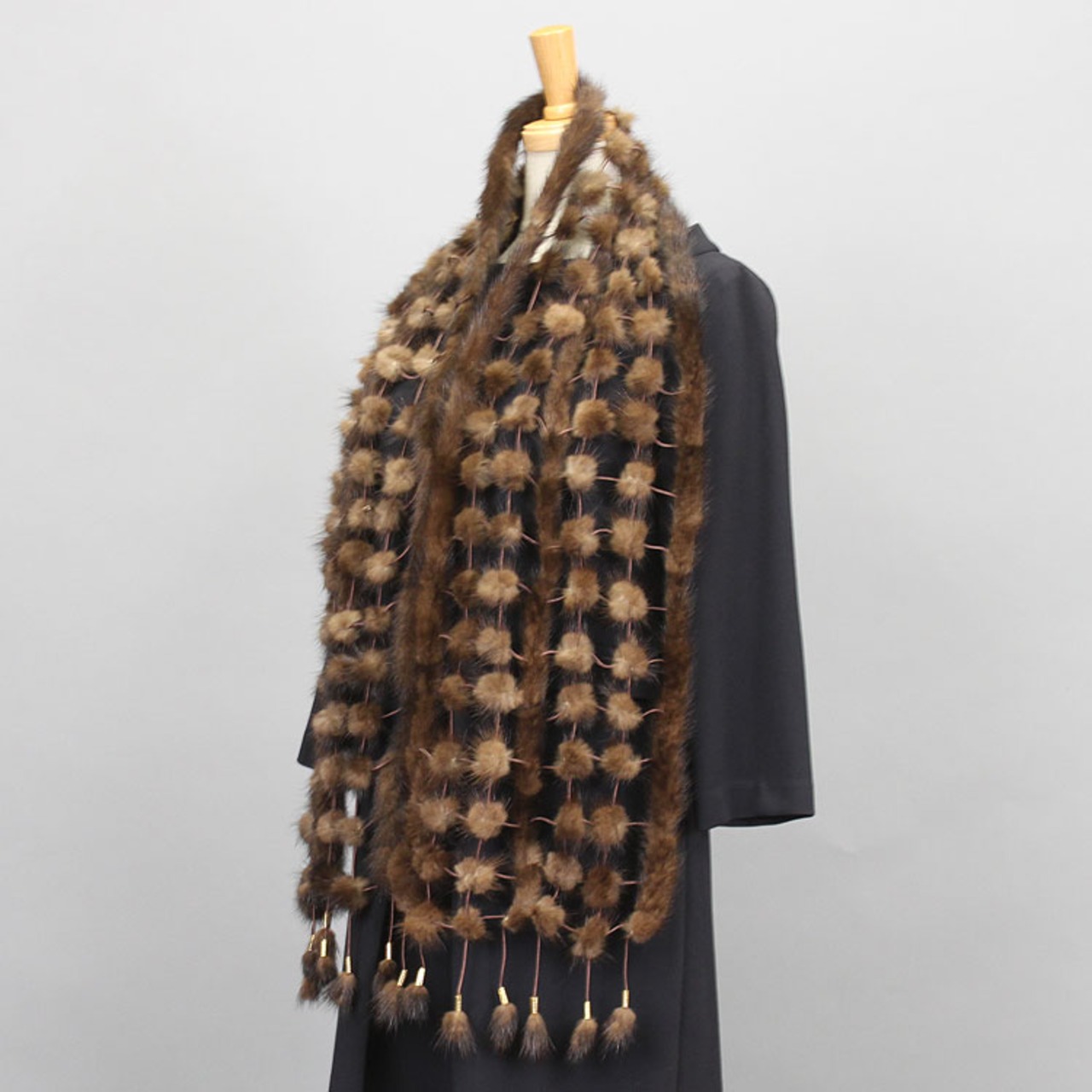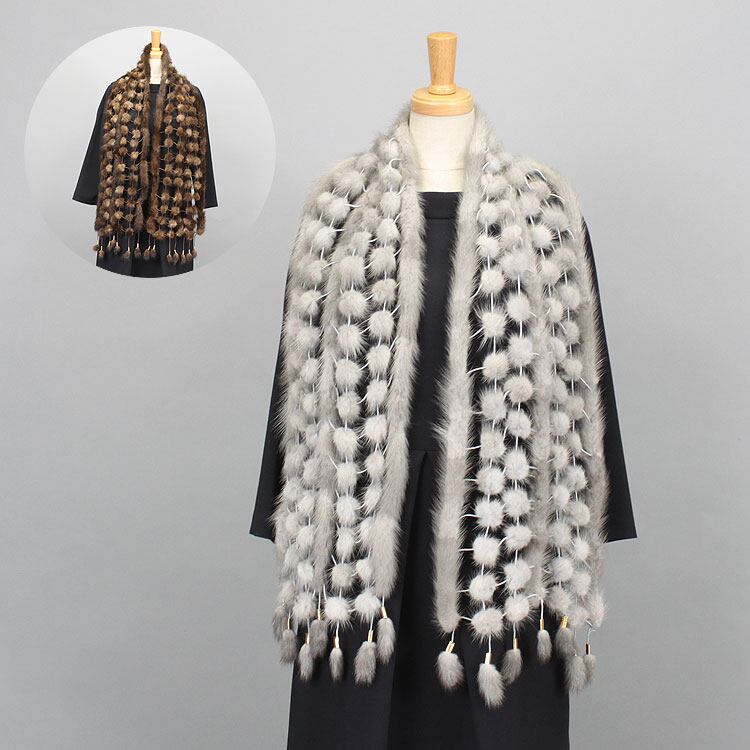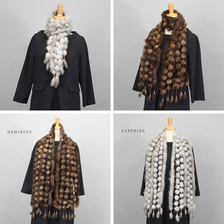 母の日 / ギフト / プレゼント / セール / 敬老の日 / 淡い輝きを放つミンクのぼんぼりを繋ぎ合わせたファーマフラー。デザイン性の高いエレガントデザイン。首周りに2重に巻けばしっかりと防寒も出来ます。