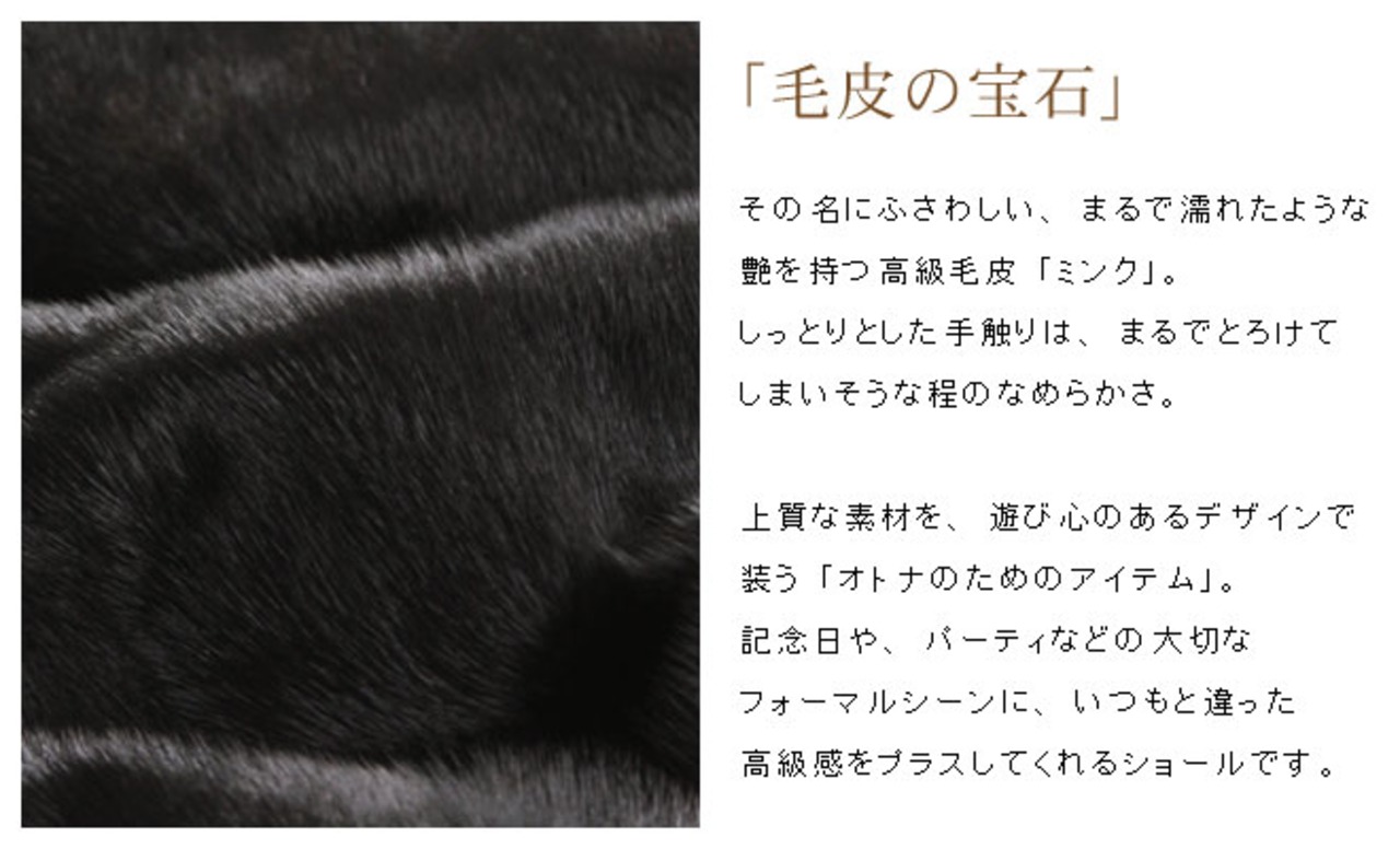 フォーマルシーンに彩を加える便利アイテム、ショール。優雅さと凛々しさを兼ね備えた上品なミンクファーを使用。4ヨウサイズの贅沢なお品です。左右両端の幅が違うアシンメトリーなデザインは、ループやケスカの使い方で印象を変えることが出来、スタイルの幅が広がります。ドレス、お着物など、どんなコーディネートにも合わせられるので入学式・卒業式などのセレモニーや、大切な記念日などに大活躍、華やかさを添えてくれます。