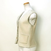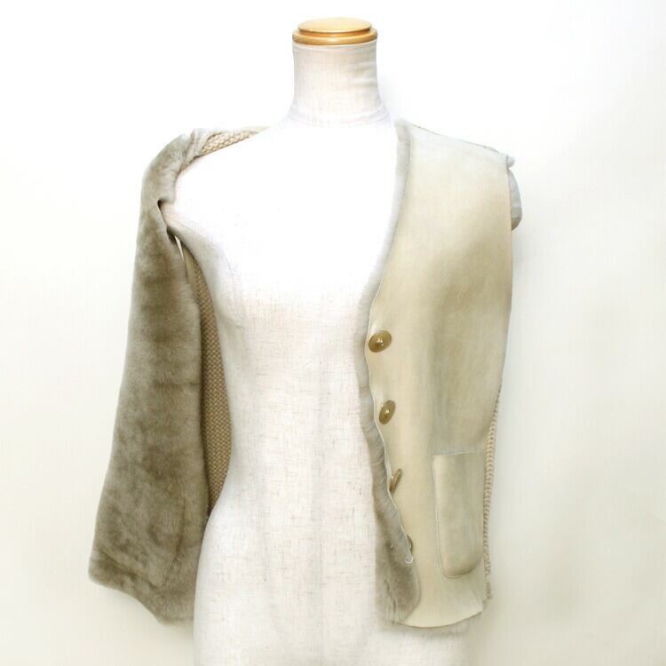 【サイズ(約~cm)※毛を含む】肩幅38 身幅44 着丈50 アームホール54 重さ:約375g 留め具:ボタン4 ポケット:外側2つ 【素材】本体:ムートン・アクリルニット