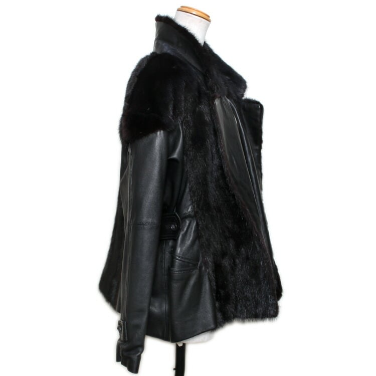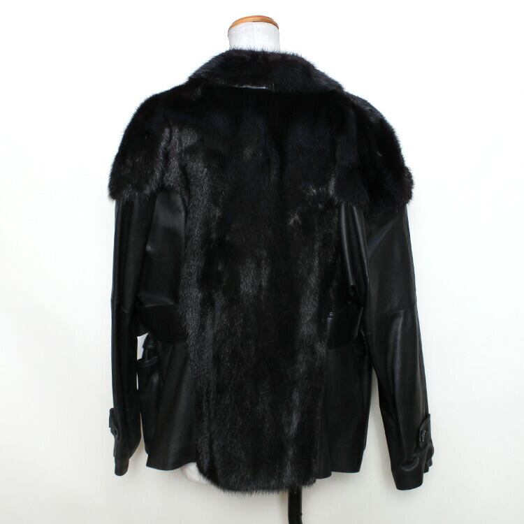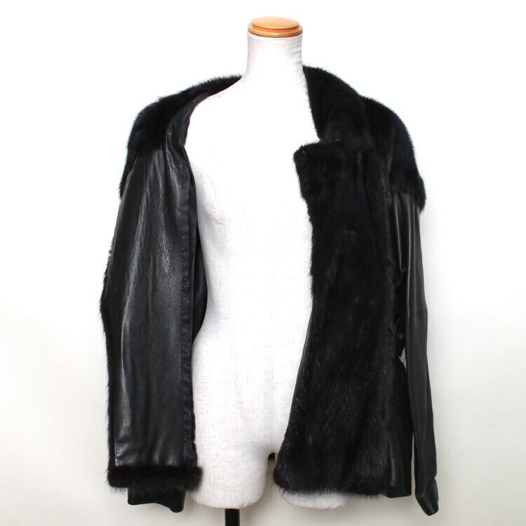 【サイズ(最大値を計測)】着丈約61cm 身幅約88cm 裄丈約83cm 【重さ】約1100g 【留め具】無し 【素材】ラムレザー ・ ミンクファー 【内側ポケット】無し 【外側ポケット】2つ 【裏地】有り