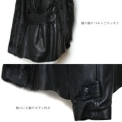 頑丈なラムレザーにナッパ加工を施し、ツヤツヤの毛革が、セレブリティな雰囲気を醸し出してくれるミンクファーをあしらった大胆なデザインのレディース用ライダース風ジャケットです。留め具はなく、羽織るデザインになっています。ワイルドさと可愛らしさ、一見マッチしないと思われるレザーとファーですが、絶妙のセンスで調和されたセンスの高い甘辛MIXデザインとなっております。勿論、本革だからこその防寒性や耐久性は抜群。『ライダースは着てみたけど男っぽいのがちょっと…』と中々一歩踏み出せない女性にも気軽に楽しんでいただける商品です。モモンガ風のビッグシルエットジャケットですが、カッチリとした襟なので、クールに決まります。ウエストラインの飾りベルトでスッキリ効果も。レザー部分はナッパ加工を施しているので、表面が銀面のように輝いてつるつるとした光沢があります。