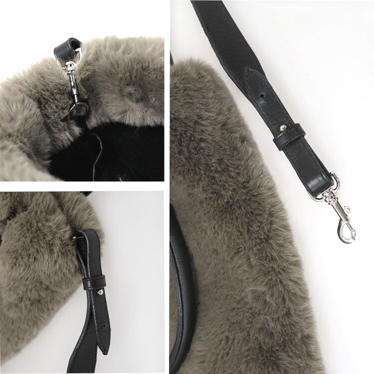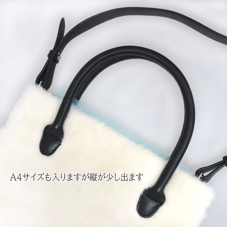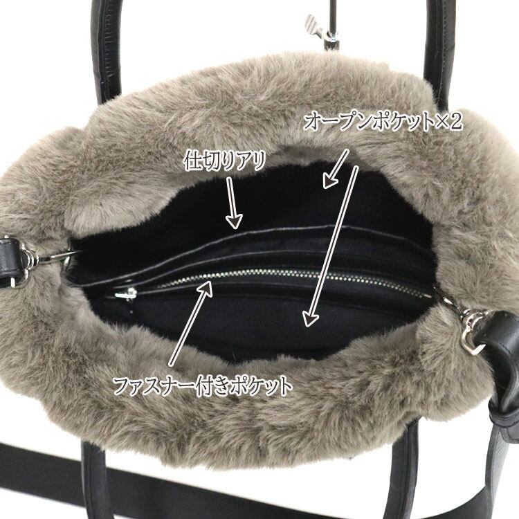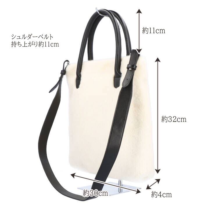 【サイズ(※毛先を含む最大部を計測)】縦幅約32cm 横幅約30cm マチ幅約4cm ハンドル持ち上がり約11cm ショルダーベルト持ち上がり約44cm 【重さ】約460g 【内側収納】ファスナー付きポケット×1 【外側収納】無し 【留め具】無し 【裏地】有り 【素材】エコファー、カウレザー