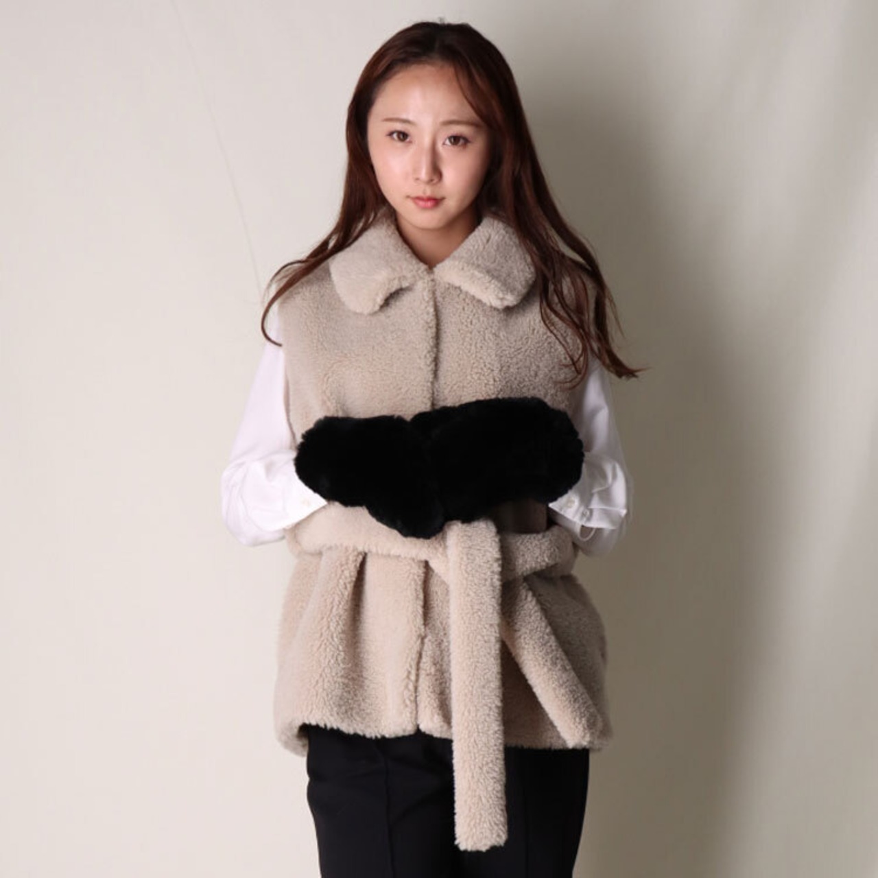 長年に渡ってファーを取り扱っている当店、エルベートが手掛けるエコファーシリーズ。本物に限りなく近い手触り、風合いの毛質をお手軽にお楽しみ頂けます。可愛らしいピーターパンカラーのエコファーベスト。非常に軽い仕上がりも特徴です。腰のベルトは取り外し可能。様々なスタイリングでご活用ください。