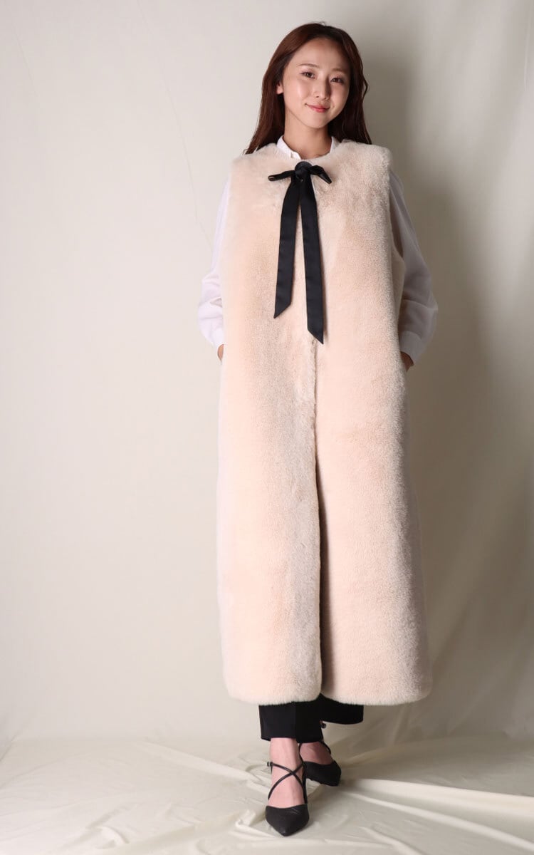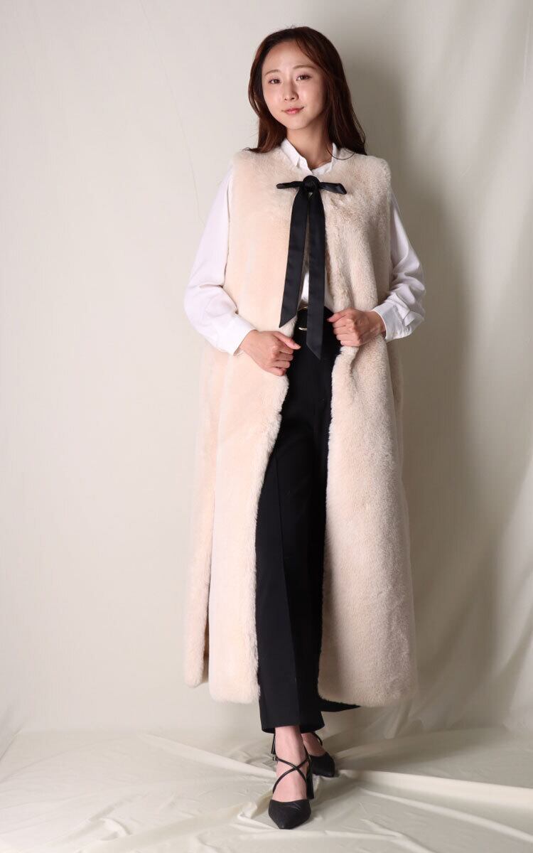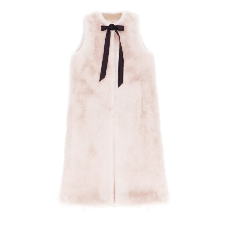 滑らかで高級感のあるレッキスラビット風のエコファーを贅沢に使ったロングファーベスト。リボンのワンポイントもフェミニンな雰囲気に。取り外しも可能です。リアルファーの見た目に合わせて作られたエコファーですが、エコファーならではの利点として、自然の毛皮には無い鮮やかな染色・発色、毛の長さの均一性によるバランスの良さ、ブラッシングによる簡単なお手入れなどが御座います。
