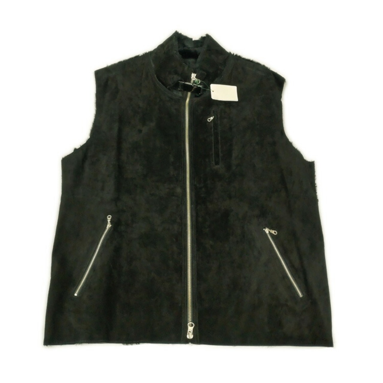 【サイズ(最大部を計測)】身幅約120cm 着丈約66cm 肩幅約50cm アームホール約60cm 【重さ】約765g 【ポケット】外側×3 【裏地】無し 【留め具】ファスナー 【素材】外側:ピッグレザー(スエード加工)、内側:ラビット