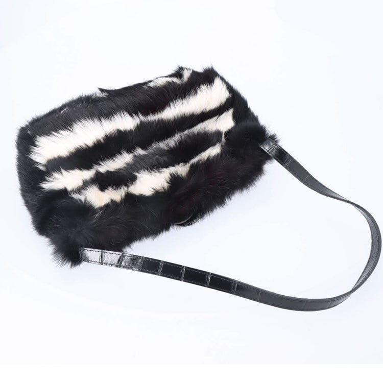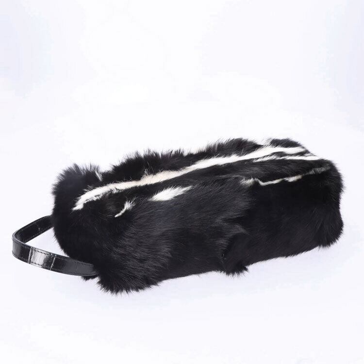【サイズ(最大部を計測)】縦幅約20cm 横幅約28cm マチ約8cm 持ち手長さ約65cm 【重さ】約235g 【ポケット】内側:ファスナー付×1 【裏地】有り 【素材】毛皮:ラビット / 持ち手・口部分:牛革 【生産国】イタリア