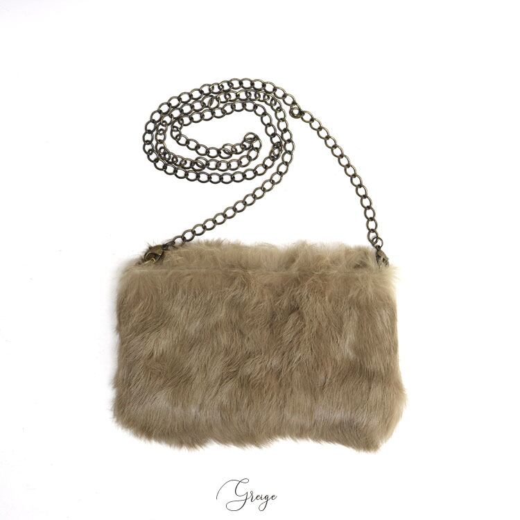 【サイズ(最大部を計測)】縦幅約13cm 横幅約21cm チェーン長さ約120cm 【重さ】約150g 【内側収納】グレージュ(オープンポケット×1)、ブラック(オープンポケット×1、ファスナー付きポケット×1) 【外側収納】無し【留め具】マグネットボタン 【裏地】有り 【素材】ラビット