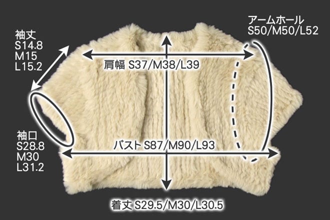 【サイズ(最大部を計測)】Sサイズ:肩幅約37cm 身幅約87cm 着丈約29.5cm 袖丈約14.8cm 袖口約28.8cm アームホール約50cm / Mサイズ:肩幅約38cm 身幅約90cm 着丈約30cm 袖丈約15cm 袖口約30cm アームホール約50cm / Lサイズ:肩幅約39cm 身幅約93cm 着丈約30.5cm 袖丈約15.2cm 袖口約31.2cm アームホール約52cm 【ポケット】無し 【留め具】無し 【裏地】無し 【素材】ラビット 【生産国】中国
