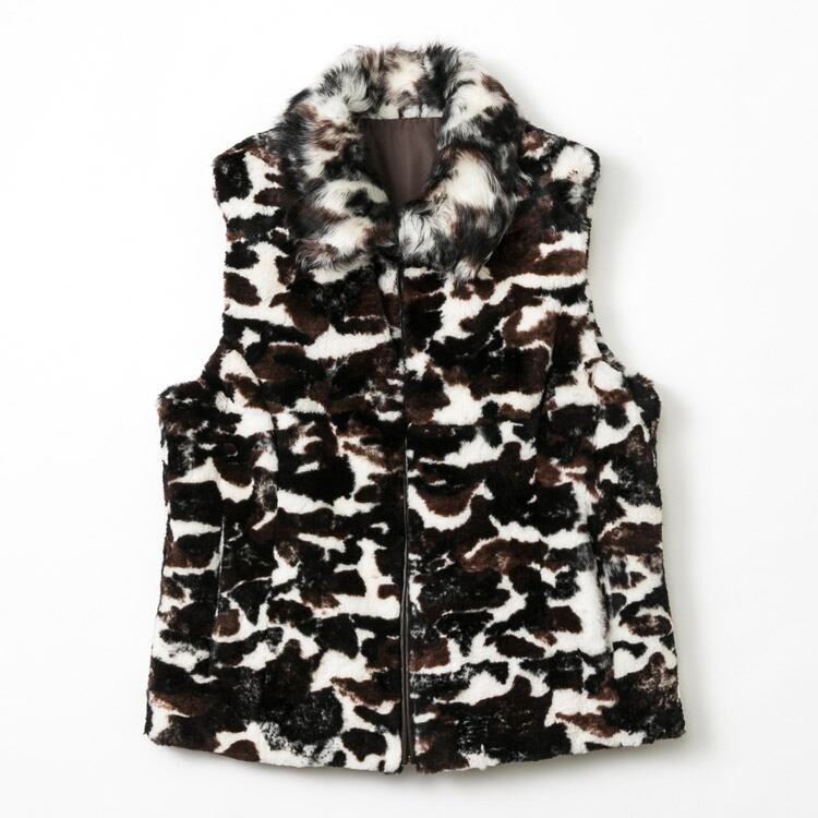 母の日 / ギフト / プレゼント / セール / 敬老の日 / 人気のカモフラージュ柄をプリントした、抜き毛加工のラビットファーベスト。抜き毛加工とは、通常最初は抜けやすい、ラビットファーの差し毛を取り除いたもの。ほとんど綿毛だけなので、毛抜けが少なくふわふわの肌触りに。主役としてニットやワンピースと合わせて。まら上からコートを羽織っても可愛いですよ。