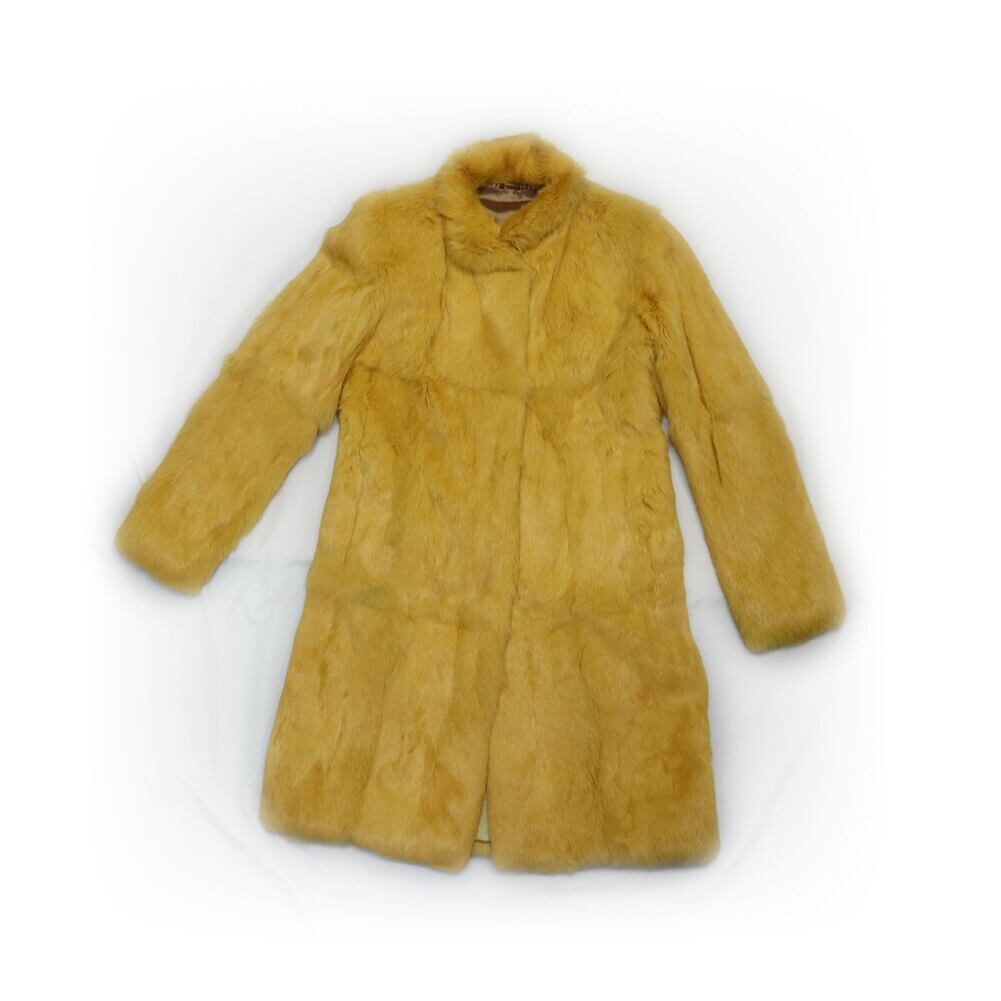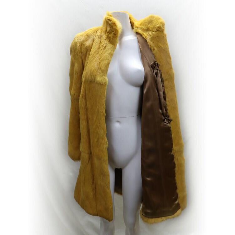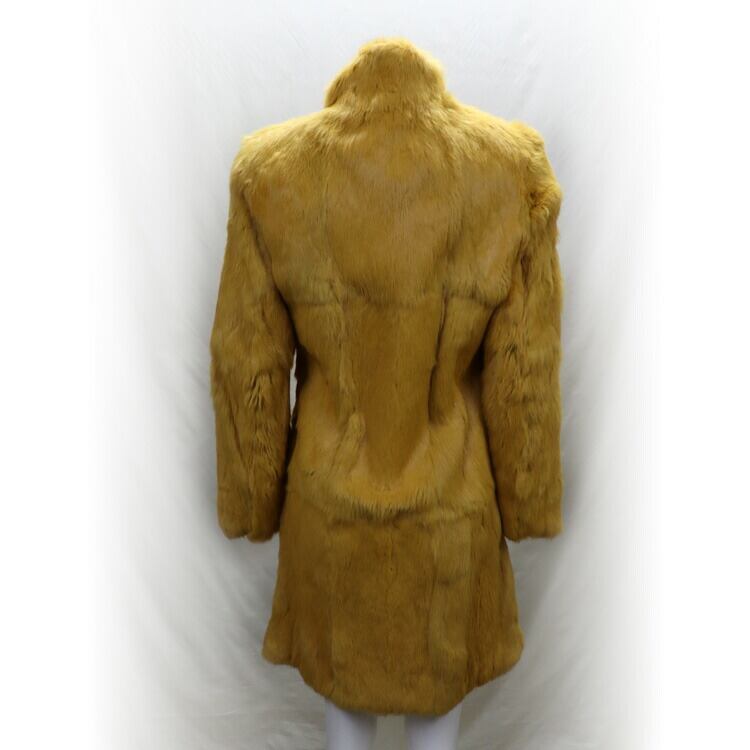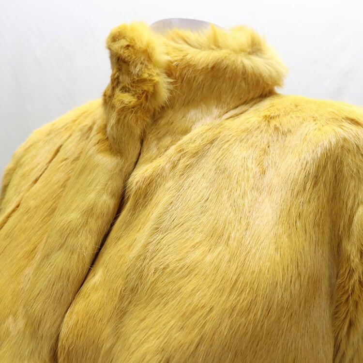 これは珍しい黄色いラビットファーのジャケット。ふわふわやわらかい肌触りで着心地も抜群。上品にもカジュアルにも似合うデザインなのでお出かけに最適です。