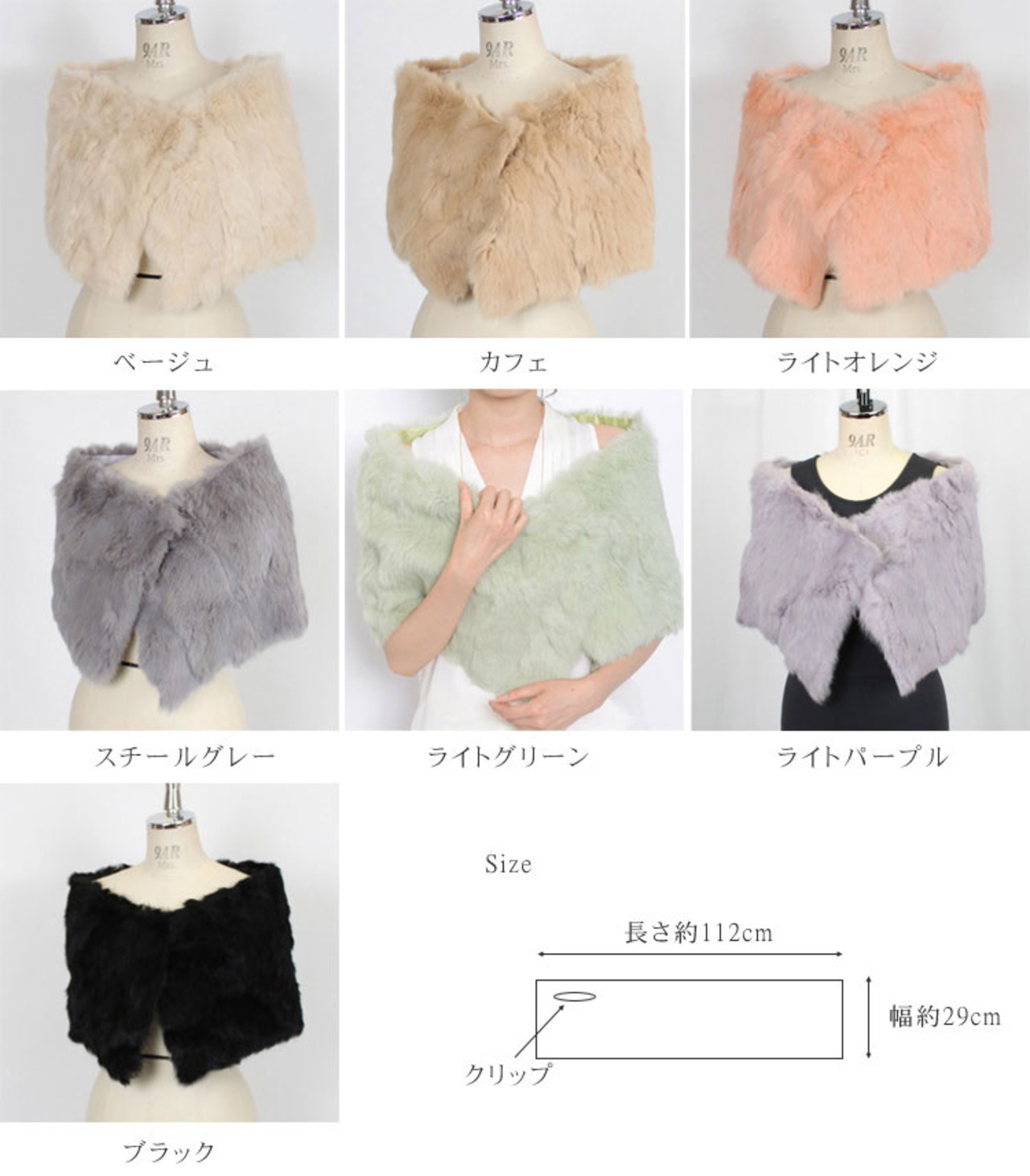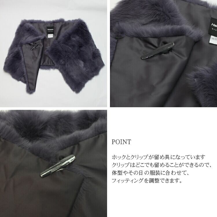【サイズ(最大部を計測)】全長約112cm 幅(着丈)約29cm 【重さ】約190g 【留め具】ホック1組・クリップ1つ ※ホックの受け(輪)はクリップと反対側のファーの中(端から約10cm)に隠れています。 【裏地】有り(ファーと同系色) 【素材】表面:ラビット / 裏地:ポリステル生地 【生産国】中国