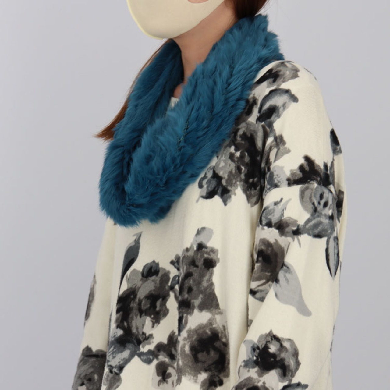 筒状のラビットファースヌード。ニットにファーを編み込んだ仕様で柔らかく、ゆったりとした見え方と優しい着け心地が特徴です。ラフな着こなしをお楽しみいただけつつ、リアルファーによる保温力、暖かさはしっかり実感できるスヌードになっております。