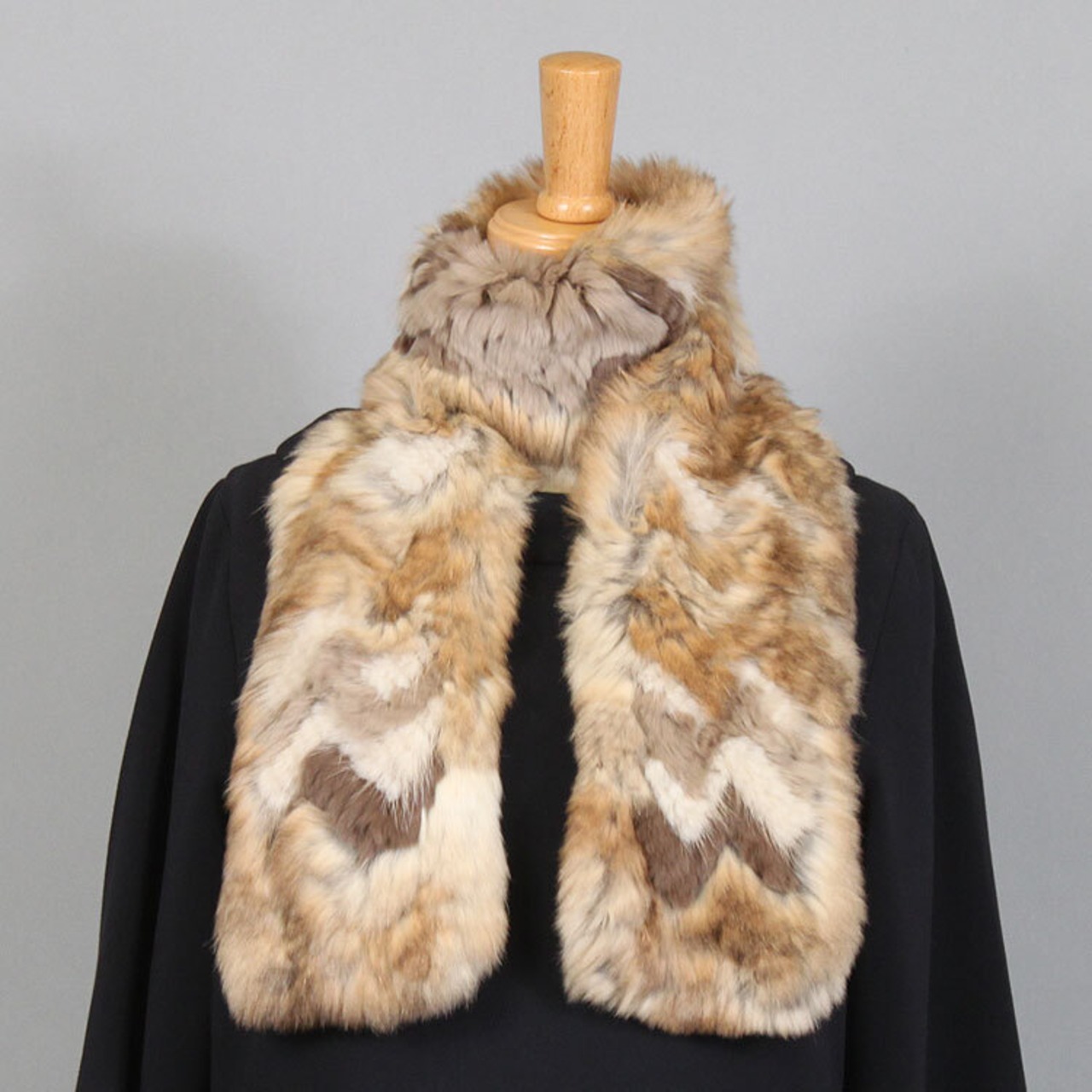 ふわふわで可愛らしいレッキスラビットファーマフラーに、一定の間隔・デザインでミンクを組み合わせました。ミンクの輝きと、毛質の違いによるコントラストが美しいマフラーです。